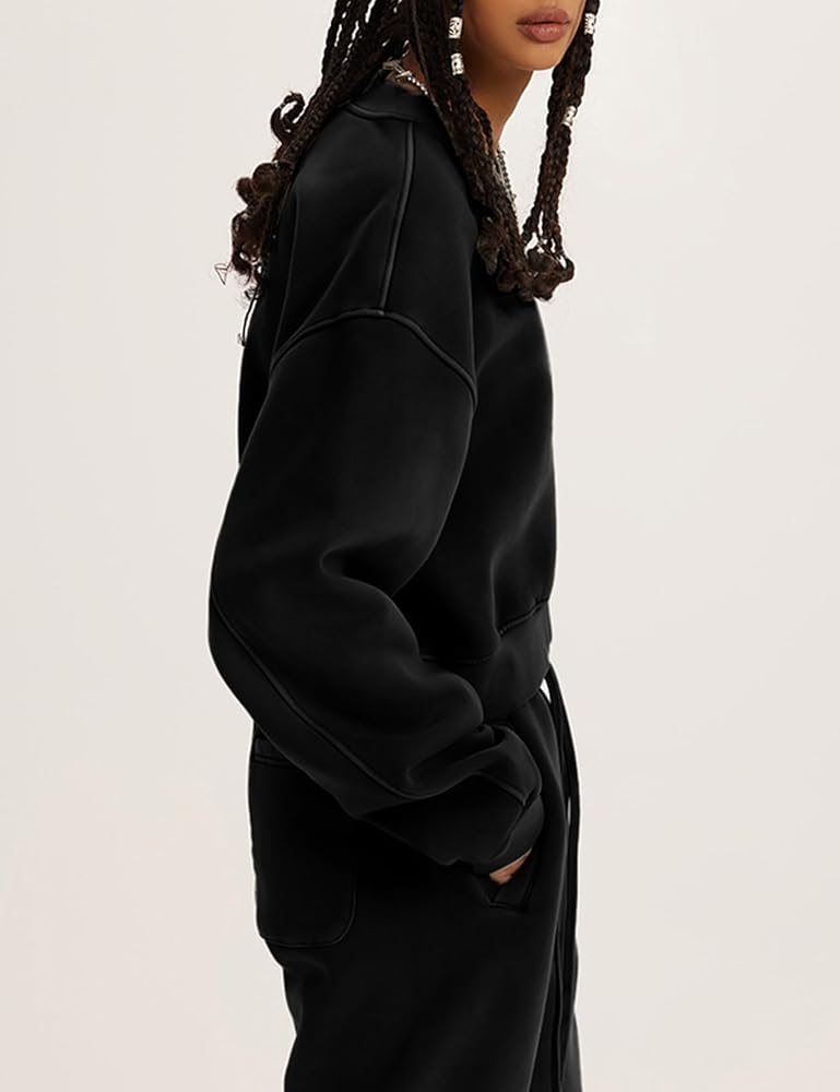 التصميم: ملابس رياضية متطابقة للجري. سويت شيرتات كبيرة الحجم برقبة دائرية، إغلاق بالسحب، كتف منسدل، أطراف أكمام وحاشية مضلعة، طول علوي قصير، سراويل عالية الخصر، خصر مرن مع أربطة قابلة للتعديل، جيبان جانبيان وجيوب خلفية، فتحة ساق مرنة، توفر الراحة والأناقة في عبوة واحدة.
