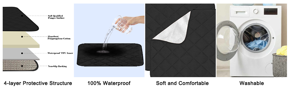 أربع طبقات حماية فائقة: طبقة علوية مبطنة تستخدم سطح حريري من البوليستر الناعم، نسيج محبوك من أجل النعومة والراحة، الطبقة الثانية مصنوعة من حشو قطن البولي بروبلين عالي الكثافة الماص من أجل امتصاص سريع وراحة إضافية. الطبقة الثالثة عبارة عن طبقة داخلية مقاومة للماء من مادة TPU تمنع السوائل من الغرق. تستخدم الطبقة السفلية تصميمًا خلفيًا غير قابل للانزلاق لضمان بقاء الوسادة في مكانها