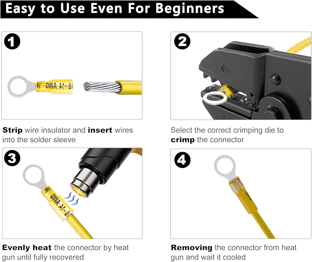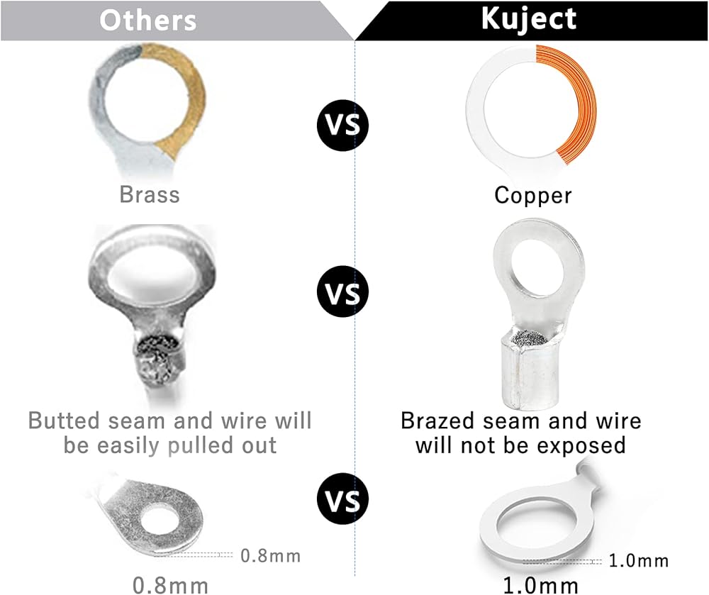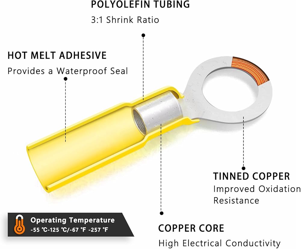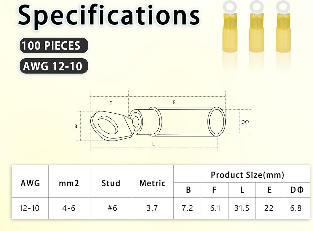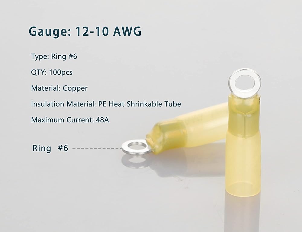 100 قطعة من أطراف حلقة الانكماش الحراري من Kuject #6، موصلات الأسلاك النحاسية المنكمشة بالحرارة، مجموعة أطراف الأسلاك الكهربائية لشاحنة القوارب البحرية للسيارات - أصفر 12-10 AWG