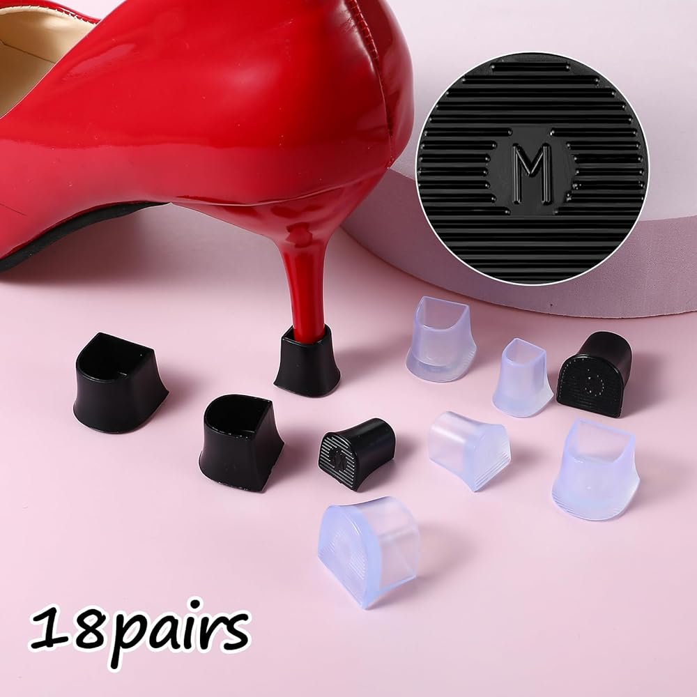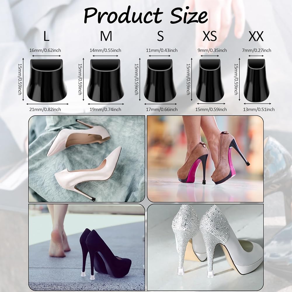 Meet Your Different Need: Heel Protector set Includes 10 pairs of stiletto heel protectors in 5 sizes including XXS(7-8mm), XS(9-10mm), S(11-12mm), M(13-14mm), L(15-16mm), each size has 2 pairs, enough for your needs,2 pairs include 1 pair of black and 1 pair of clear, enough to match any pair of your high heels.