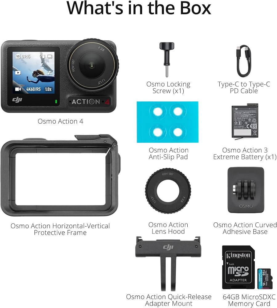 تتضمن الحزمة: مجموعة كاميرا DJI Osmo Action 4 القياسية وبطاقة MicroSD سعة 64 جيجابايت من Kingston
