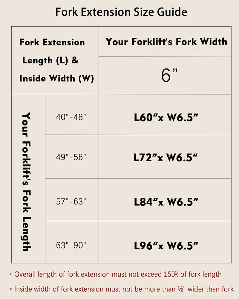 [يناسب الرافعات الشوكية بعرض 6.5 بوصة]: يتميز بطول 96 بوصة وعرض 6.5 بوصة لشوكة البليت بعرض 6.5 بوصة؛ يوسع حجم الشوكات الأصلية لتحمل المزيد من الأحمال لكل مصعد.
