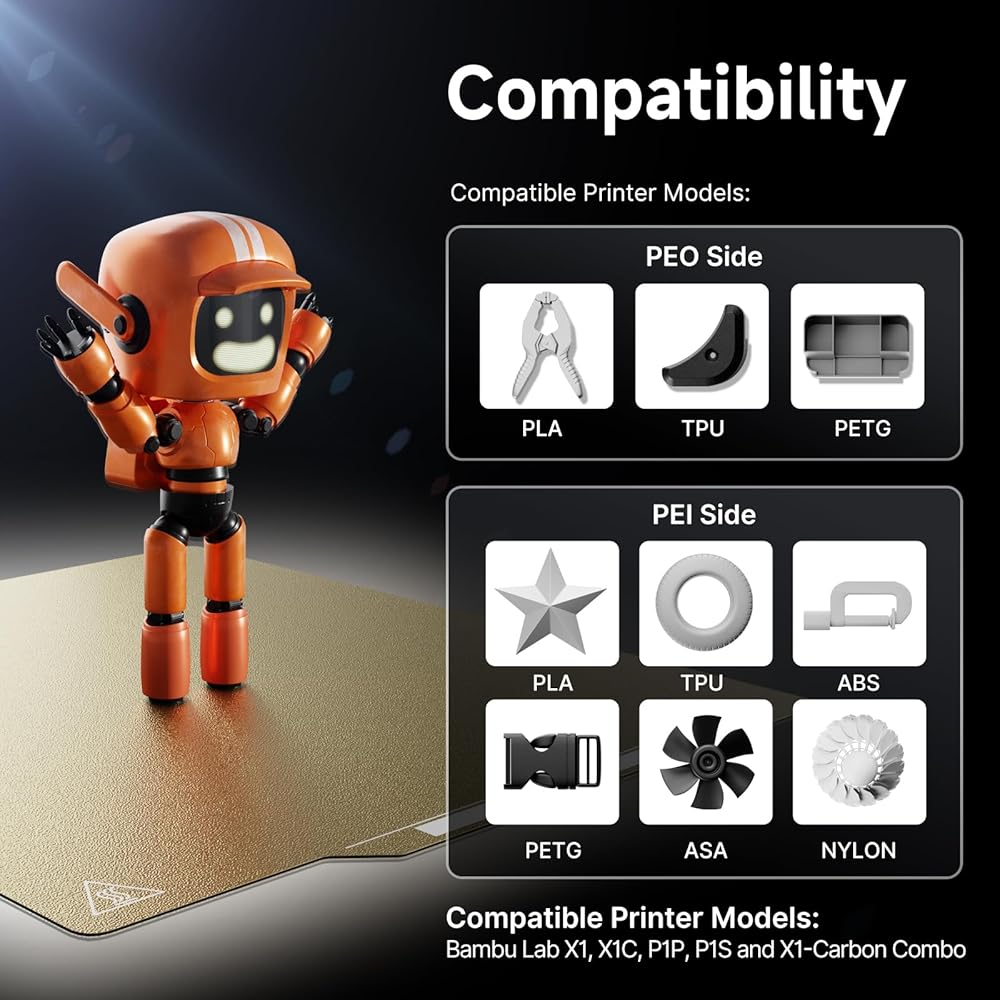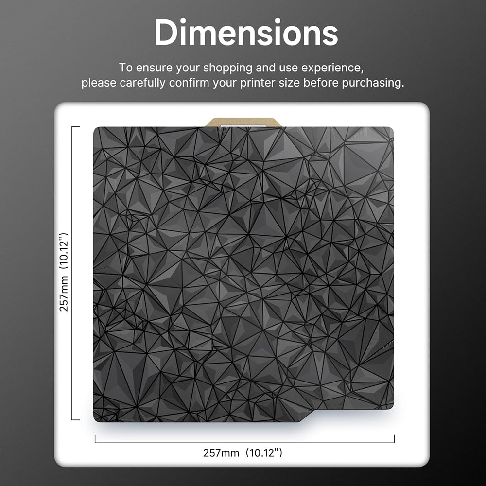 نماذج الطابعة ثلاثية الأبعاد المتوافقة: بحجم 257*257 مم (10.12*10.12 بوصة)، تتوافق لوحة التصميم هذه مع Bambu Lab A1 وX1 وX1C وP1P وP1S وX1-Carbon Combo. يرجى التأكد من طراز الطابعة الخاصة بك قبل الشراء. بعد التثبيت، يرجى التأكد من إعادة تسوية سرير الطباعة لتحسين جودة الطباعة.