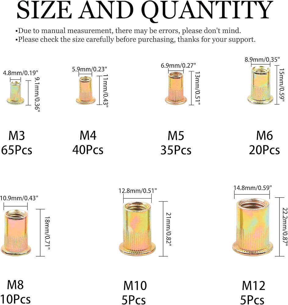 --Contains 180pcs metric rivet nuts, 7 sizes meet various demands.