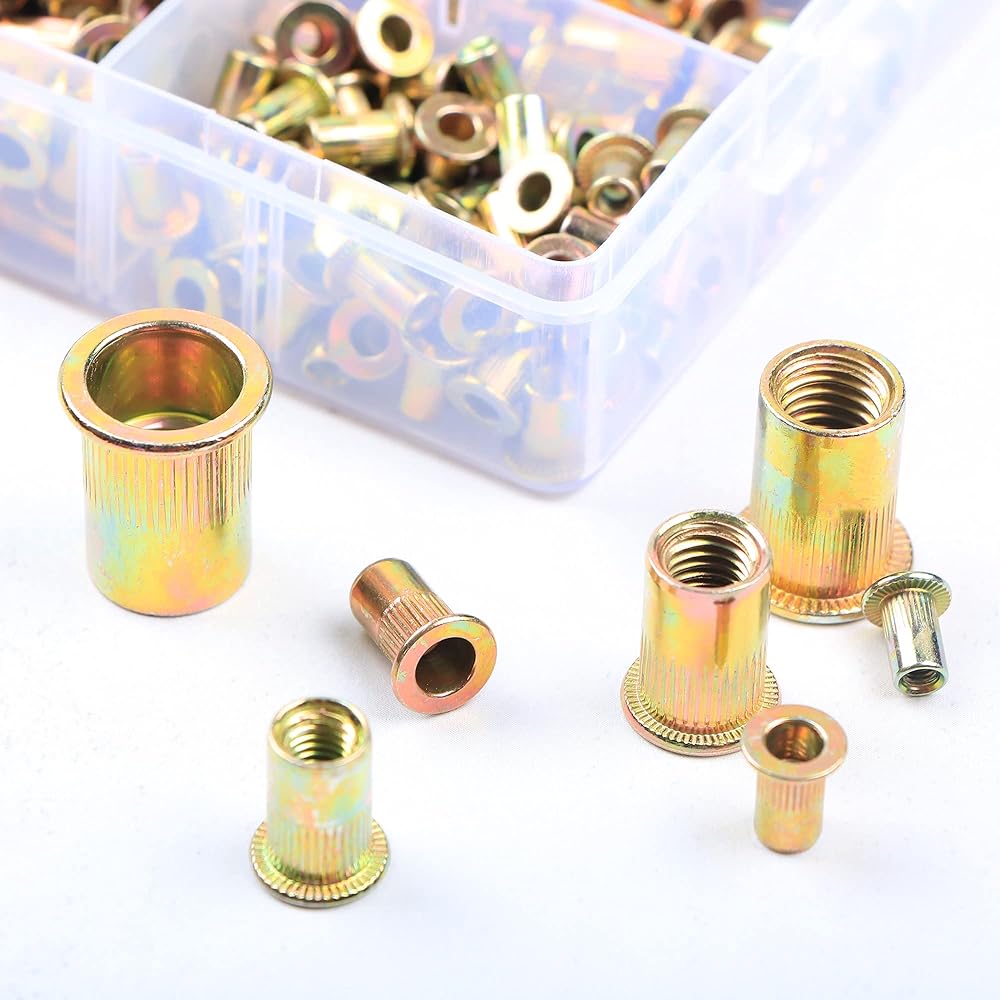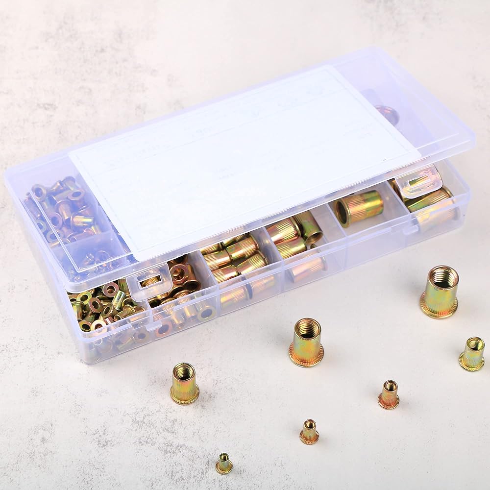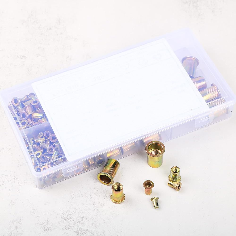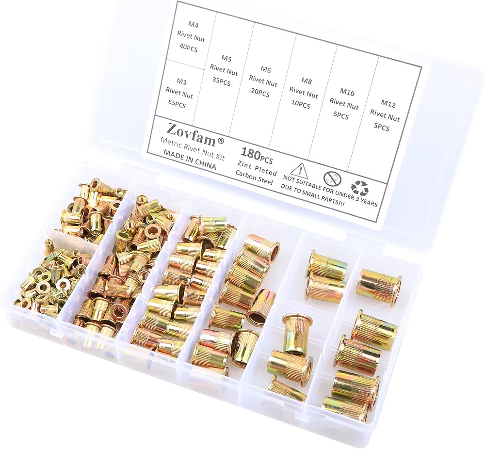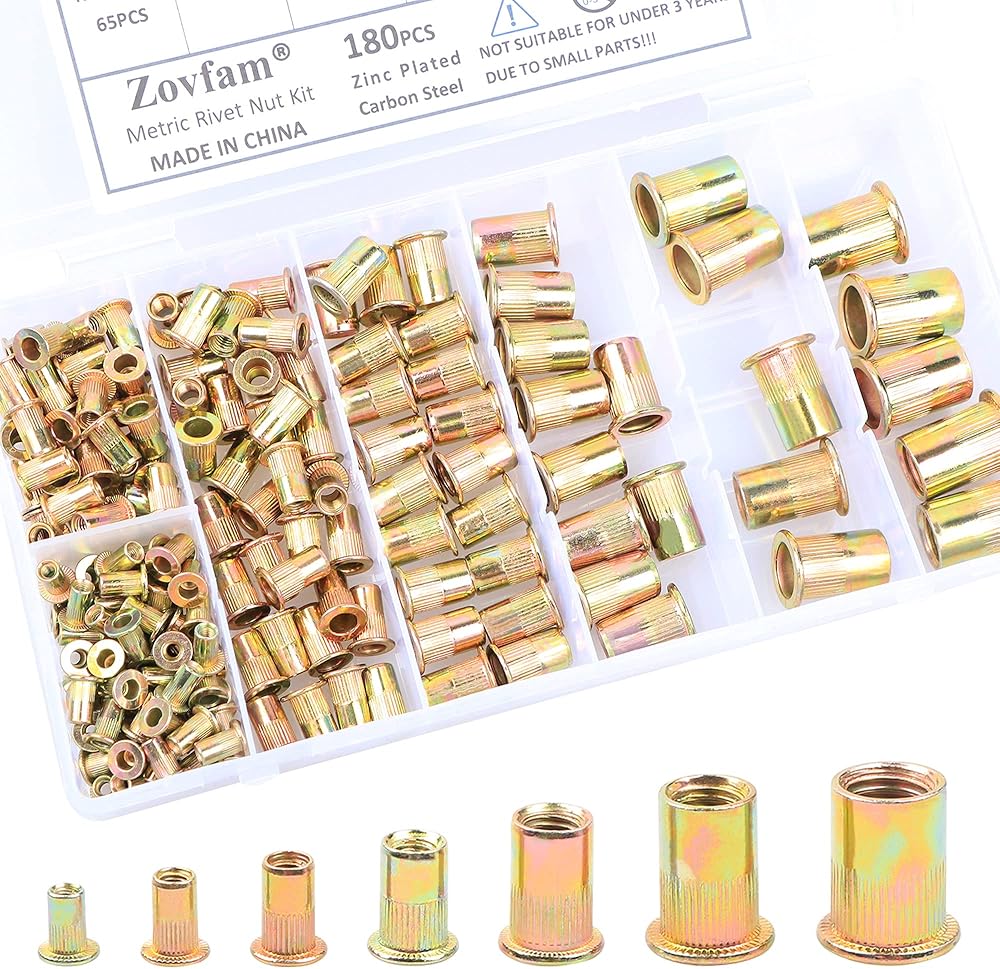 180PCS Metric Zinc Plated Carbon Steel Rivet Nut Flat Head Threaded Insert Nutsert Assortment Kit - 7 Sizes:M3 M4 M5 M6 M8 M10 M12