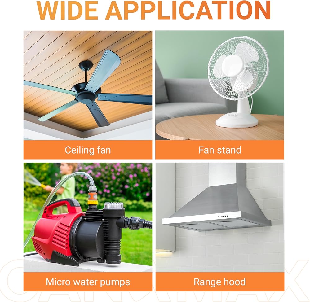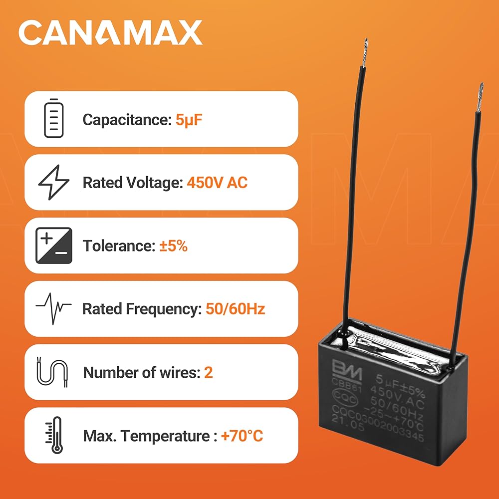 اجعل مروحة السقف تعمل بشكل أسرع: يعمل مكثف مروحة السقف CBB61 5μF 2-Wire 250V 450V على تشغيل وتشغيل المحركات أحادية الطور في أنظمة الطاقة الكهربائية بتردد 50 هرتز/60 هرتز. إذا كانت مروحة السقف لديك تعمل بشكل أبطأ من المعتاد، أو لا تعمل على الإطلاق، أو غير قادرة على ضبط السرعات كما كانت تفعل من قبل، فيرجى التحقق من مكثف مروحة السقف CBB61 أولاً. قد يكون المكثف محترقًا أو ضعيفًا، وستحتاج إلى استبداله بآخر جديد.