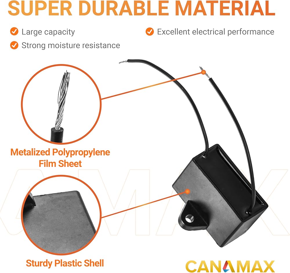 جودة متينة ومتفوقة: مكثف مروحة السقف CBB61 5μF 2-Wire 250V 450V مصنوع من طبقة غشاء بولي بروبيلين معدنية مع غلاف بلاستيكي، وهو متين، وخسارة صغيرة، ومقاومة قوية للرطوبة وأداء كهربائي ممتاز. لقد تم اختباره جيدًا من قبل الشركة المصنعة لضمان الجودة وعمر الخدمة.