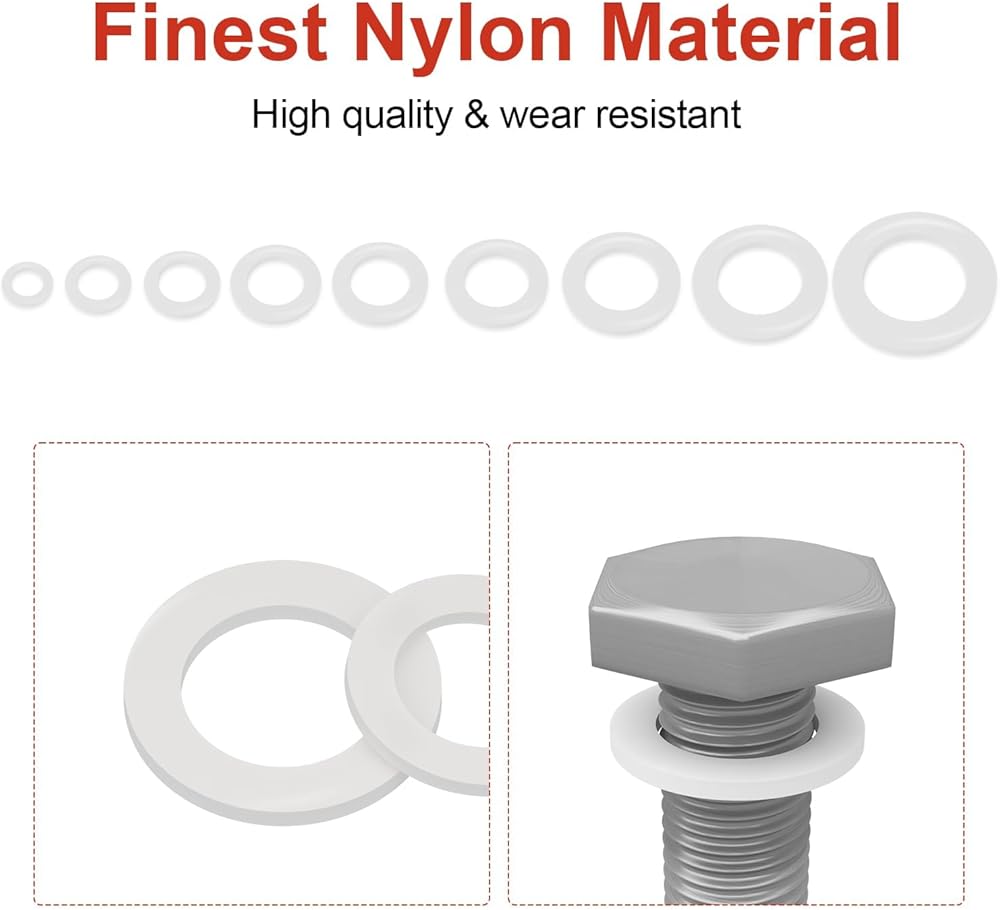 【High-quality Material】 Made of Nylon, flat washers are wear-resisting and moisture resistant, ensuring long lasting service life. In addition, you can rest assured that the flat washer will prevent electrical shorts between metal and metal.