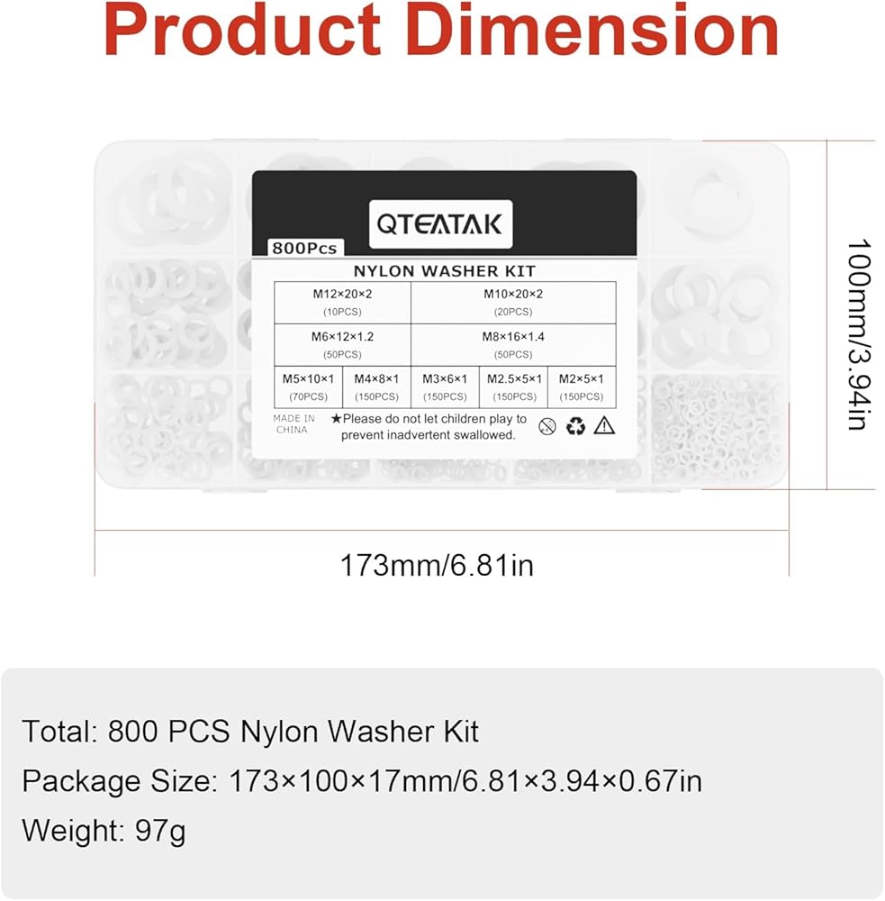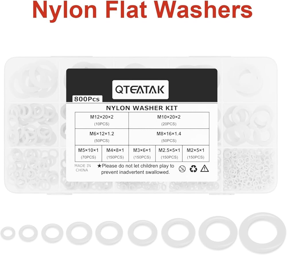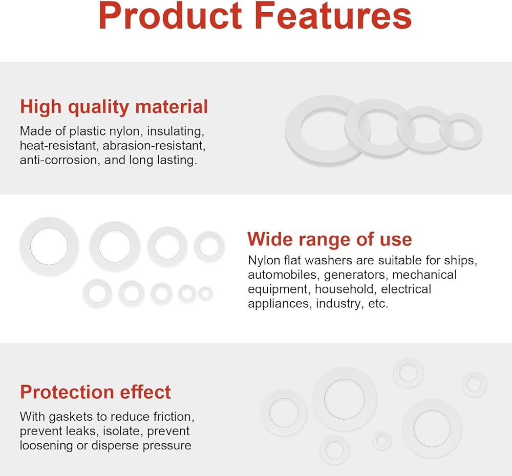 9 different common used sizes: M2, M2.5, M3, M4, M5, M6, M8, M10 and M12 Perfect for threaded/bolt-type connections on commercial and household appliances Easy to distinguish flat washers of different diameters Portable box makes it easy for you to carry Can be used several times in different occasions Nylon material makes it wear-resisting and high temperature resistant Serve as a bearing surface for fastener load distribution and resistance to abrasion