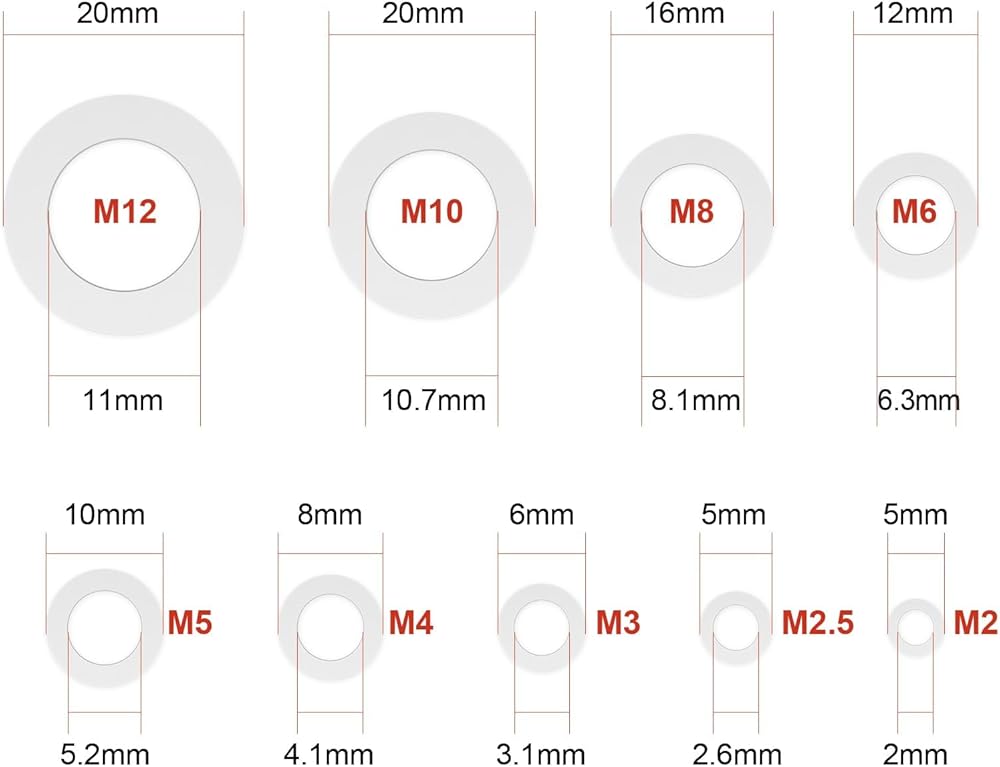 【Different Sizes of Flat Washer】The nylon flat washer assortment kit contains 9 different common used sizes including M2, M2.5, M3, M4, M5, M6, M8, M10 and M12. You can choose the suitable flat washer according to your diverse screws and bolts.
