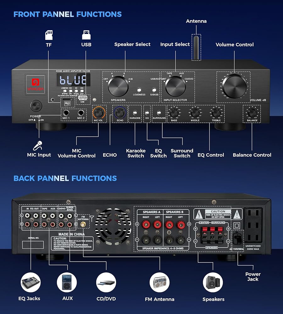 [خيارات الاتصال المحسنة] يعمل جهاز استقبال المسرح المنزلي على رفع مستوى إعداد الصوت لديك من خلال مجموعة من خيارات الإدخال بما في ذلك اللاسلكي، وUSB، وSD، وCD/DVD، وAUX، والميكروفونات المزدوجة. يمكنك الاتصال بسلاسة بمجموعة متنوعة من الأجهزة لتعزيز المرونة والراحة في تجربتك الصوتية