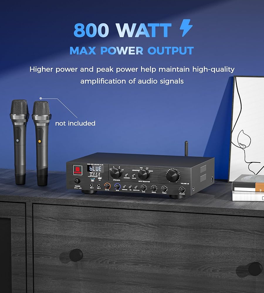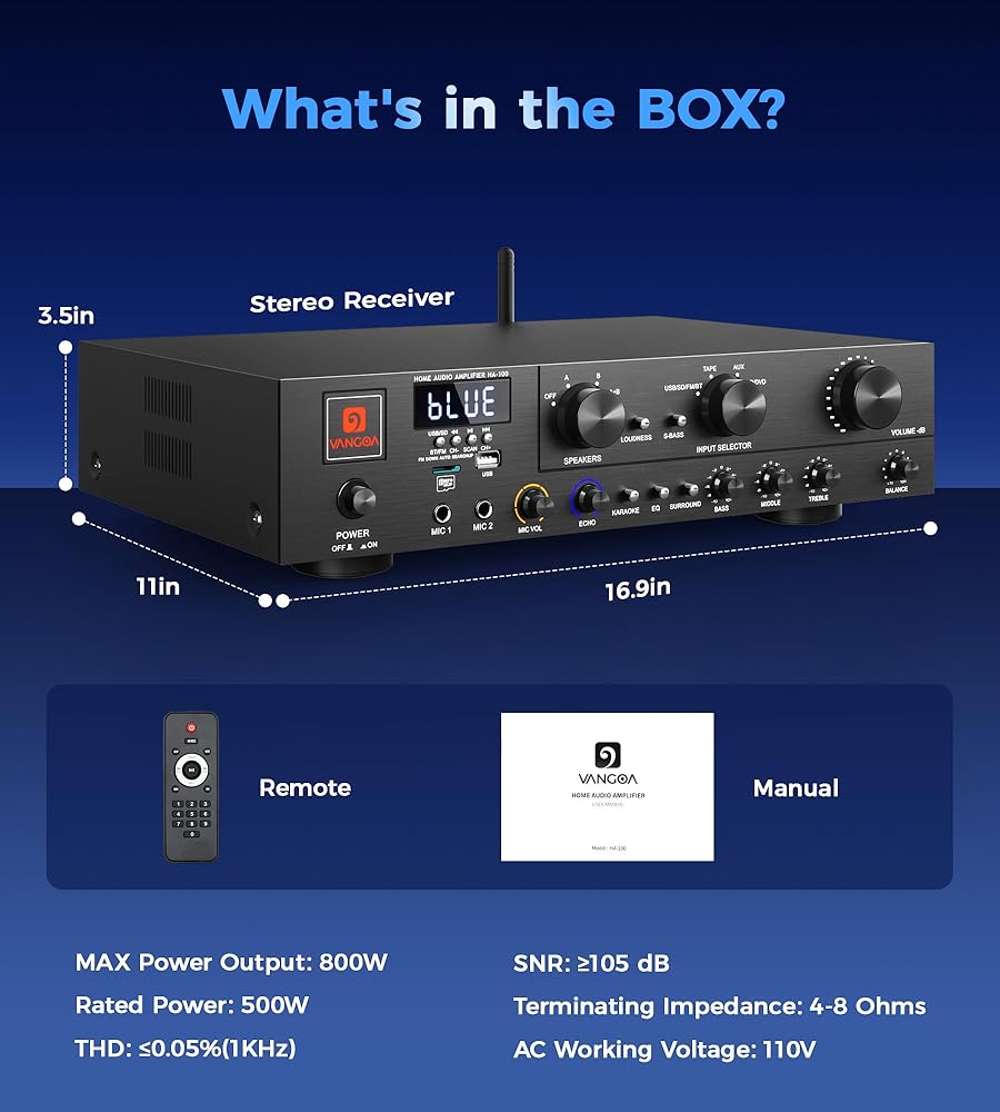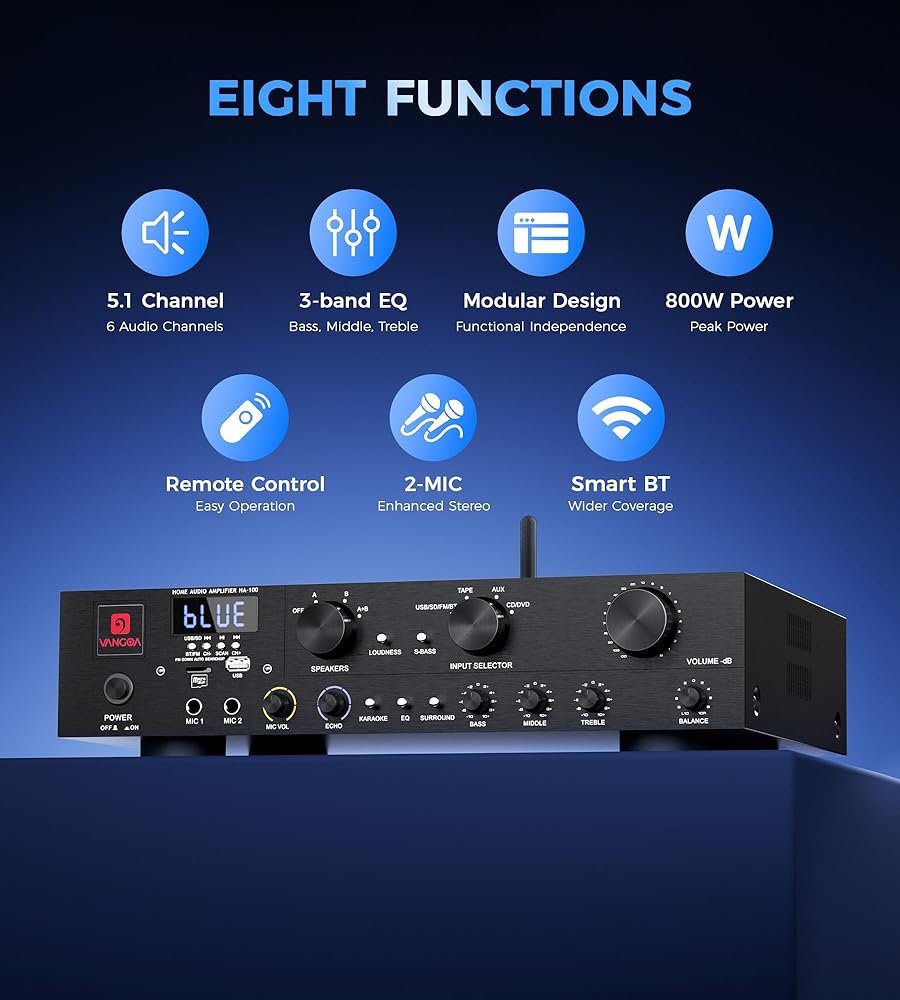 أجهزة استقبال ستيريو مضخم الصوت المنزلي من Vangoa مع نظام ستيريو مضخم طاقة لاسلكي 800 قوة قصوى 5.1 قناة مع USB وSD وFM و2 ميكروفون وRCA و3 نطاقات EQ ومحدد مكبر الصوت للاستوديو والمسرح المنزلي
