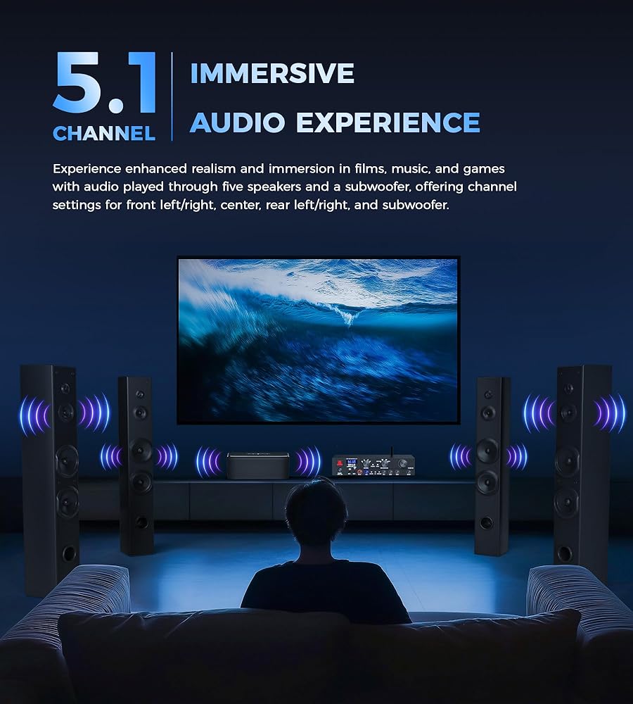[أنيق وعملي] يتميز بهيكل معدني أنيق مع لمسة نهائية مصقولة بأكسيد أسود متطور، هذا مكبر الصوت المنزلي ذو 6 قنوات يجسد الأناقة والمتانة. ويضمن التصميم البديهي للأزرار وعناصر التحكم المنفصلة تجربة سهلة الاستخدام، مما يجعل التشغيل سهلاً لجميع العملاء