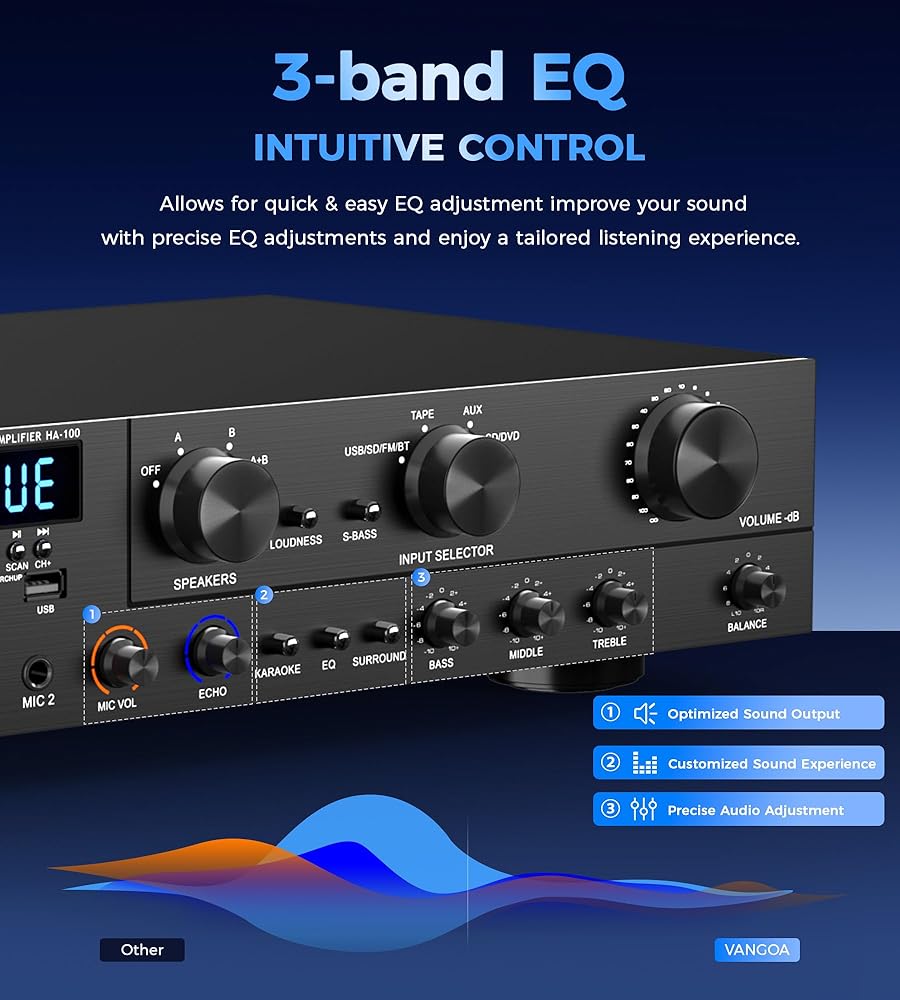 [تحكم بديهي 3 نطاقات EQ] يحتوي جهاز تضخيم الصوت على مقبض دوار وأزرار واضحة للثلاثة أضعاف، والباس، والحجم الرئيسي، والصدى، وحجم الميكروفون، وتكوين نغمة الميكروفون، ومحدد وضع إدخال المصدر. لذلك يمكنك بسهولة ضبط مستويات الصوت حسب رغبتك