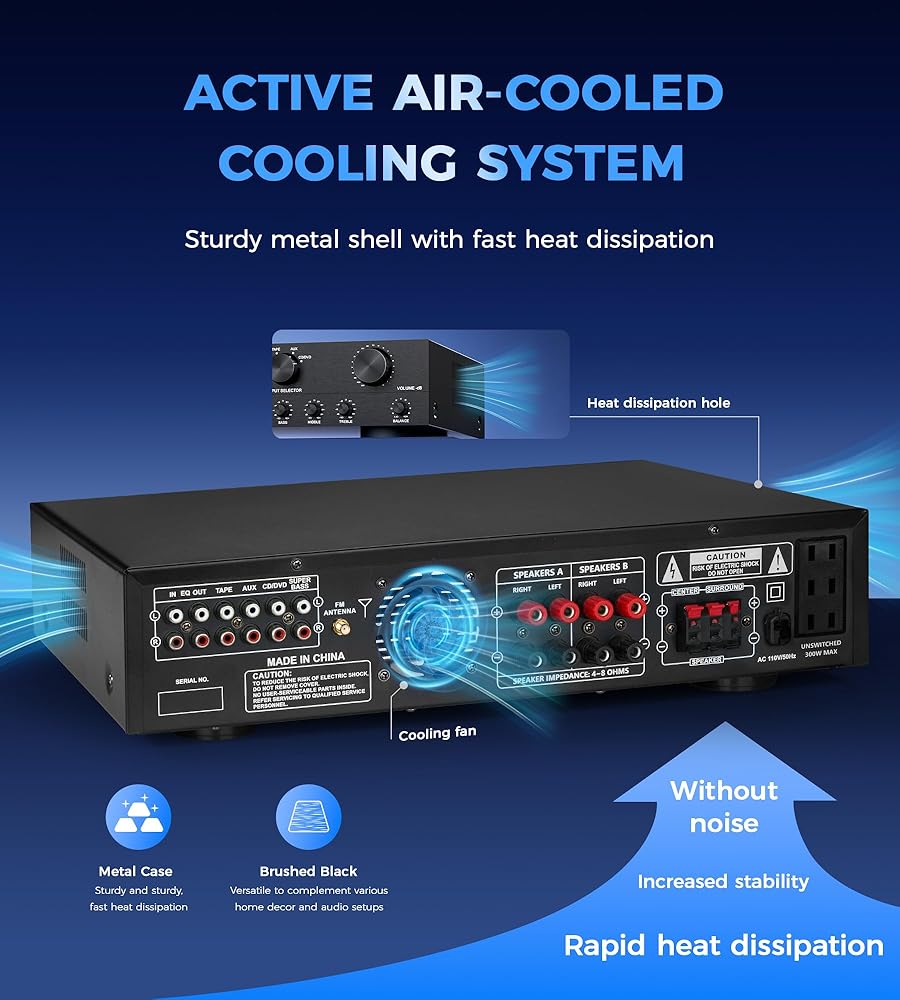[أنيق وعملي] يعمل نظام التبريد المبتكر لنظام المسرح المنزلي الصوتي، الذي يشتمل على مراوح تبريد مدمجة وأحواض حرارة وفتحات جانبية، على تعزيز كفاءة التبريد بنسبة 130% مقارنة بطرق التبريد الطبيعية التقليدية. وهذا يضمن إخراجًا مستقرًا ويطيل عمر الجهاز
