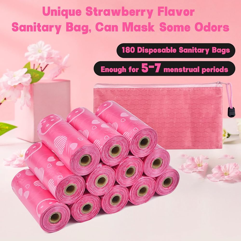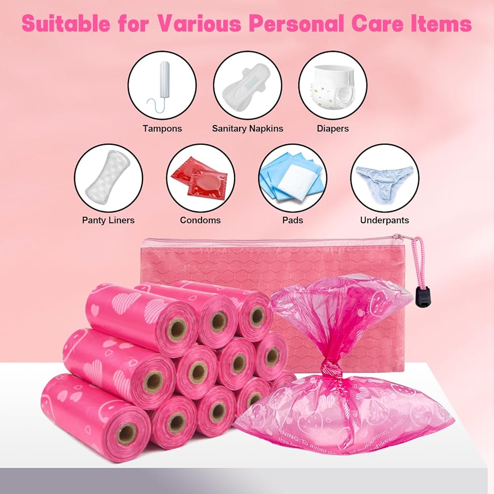 ستحصل على: تحتوي العبوة على 180 قطعة من الأكياس الصحية الوردية التي تستخدم لمرة واحدة، و12 لفة، كل لفة مكونة من 15 قطعة، تكفي للاستخدام لمدة 5-7 فترات الحيض. يمكنك حمل المناديل الصحية والحفاضات وغيرها من العناصر. تأتي مع سحاب للتخزين. حقيبة ومريحة للتخزين