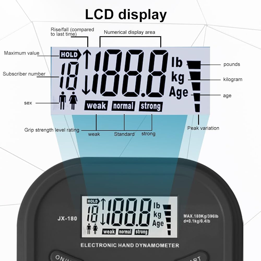 【LCD DISPLAY】On the large lcd display, all measurements are clearly displayed on the same screen. displayed readouts include user code, age, gender, grip strength value in pounds or kilograms, and grip status.