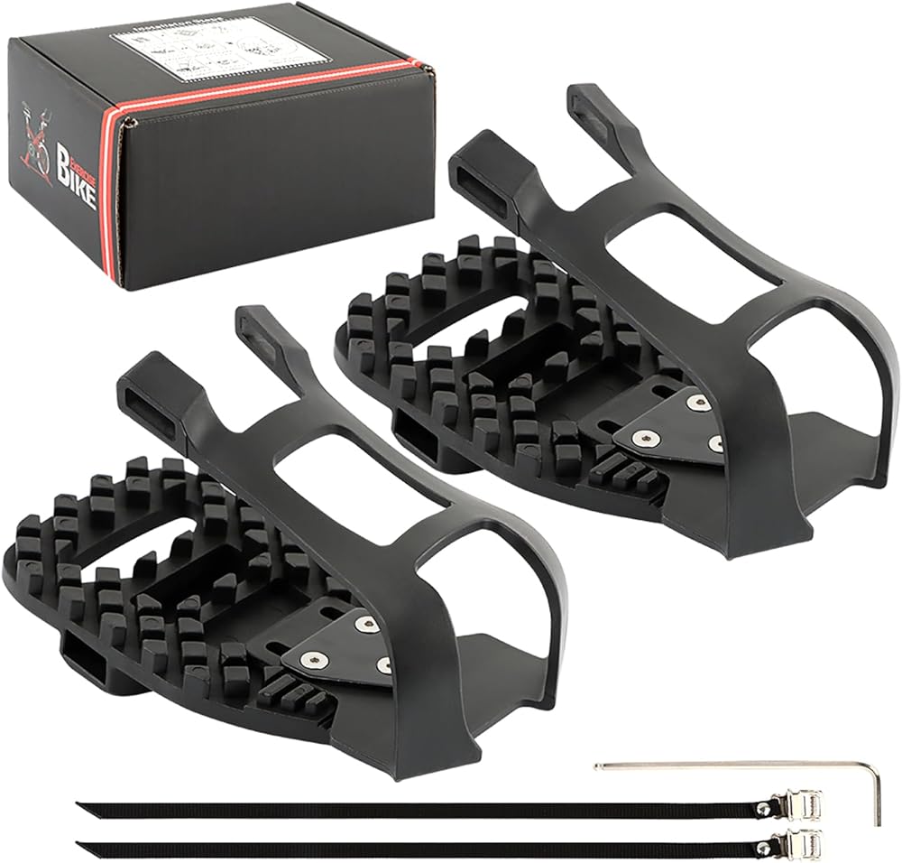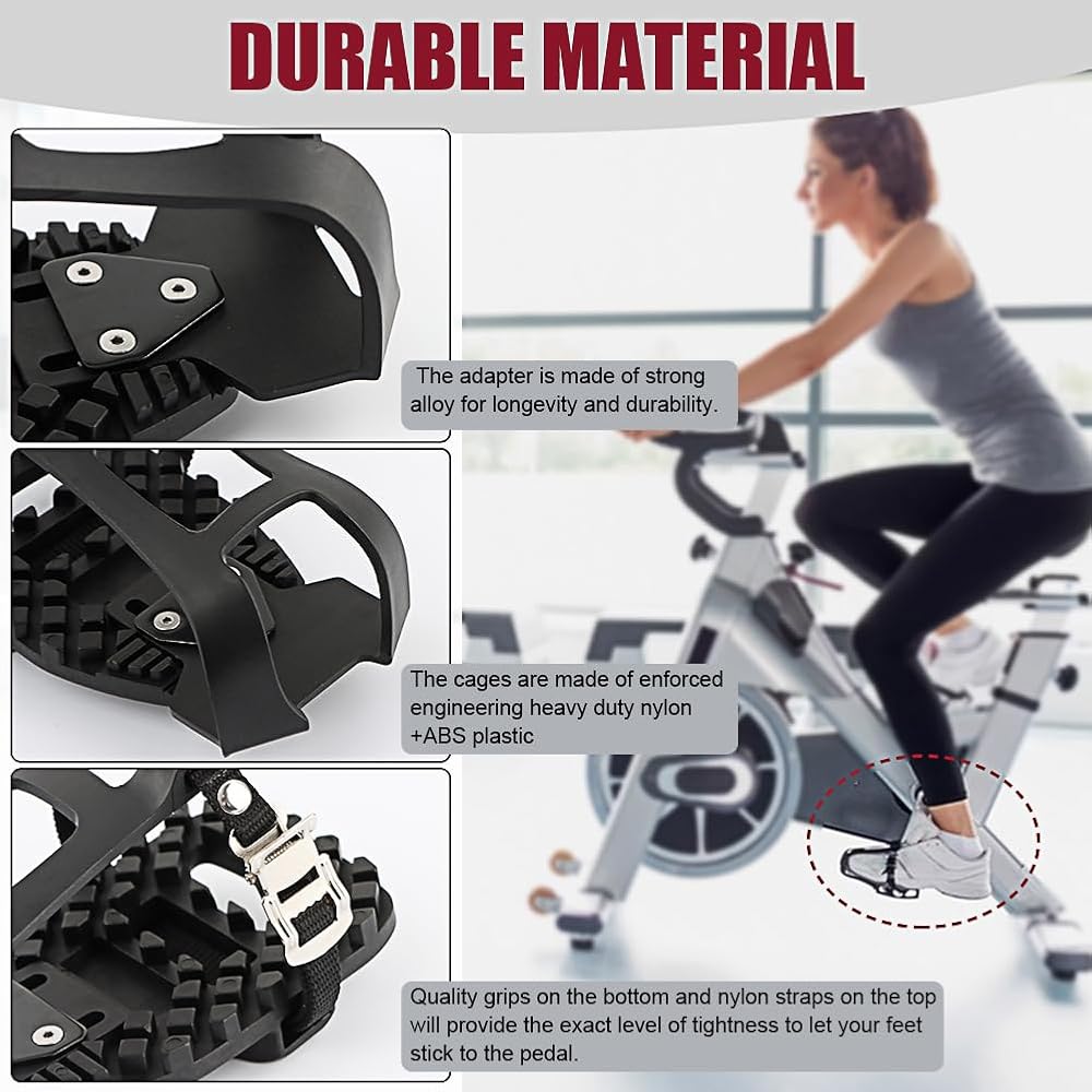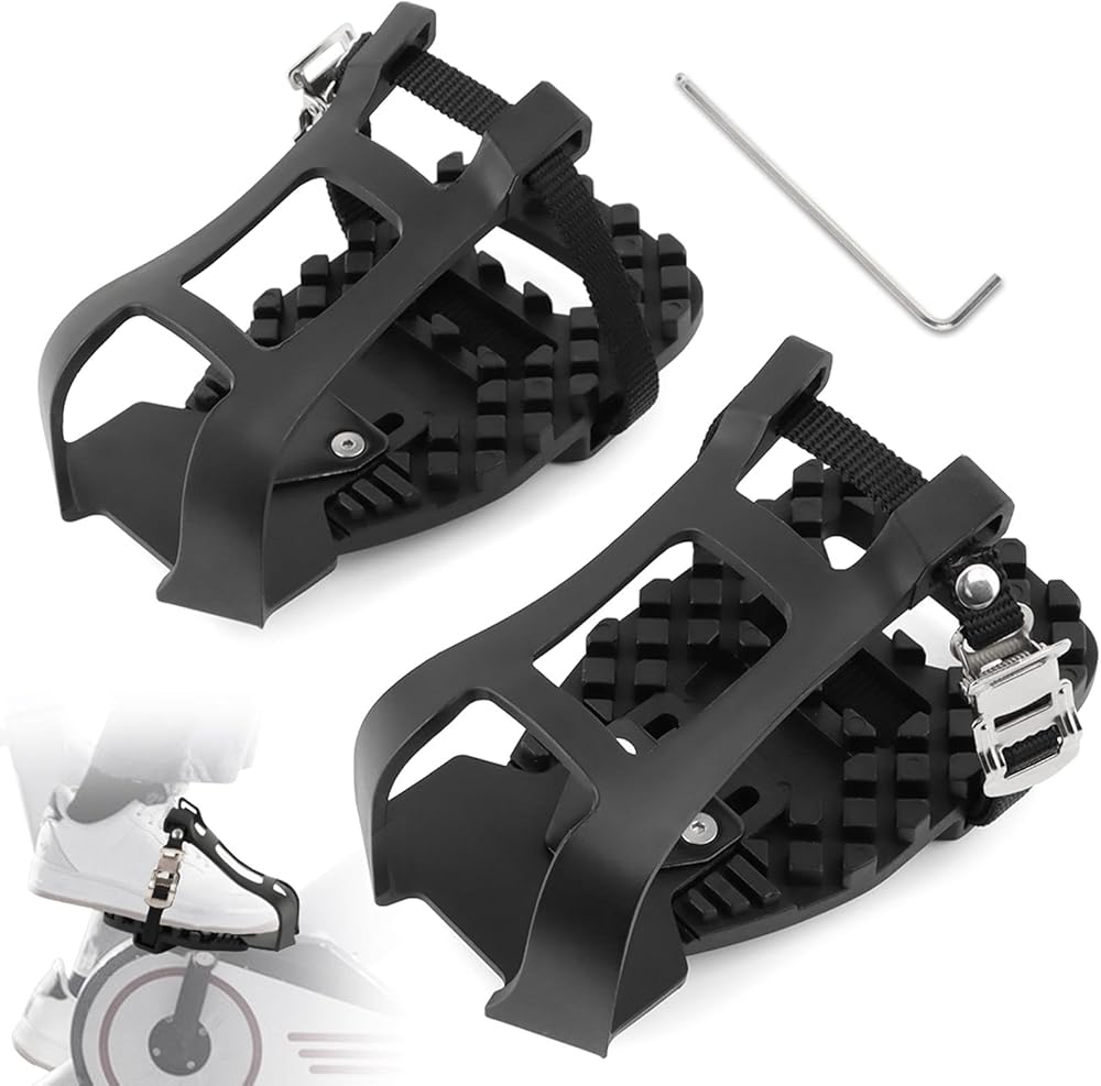 【مادة متينة】 المحول مصنوع من سبيكة قوية لطول العمر والمتانة. الأقفاص مصنوعة من النايلون عالي التحمل الهندسي + بلاستيك أكريلونتريل بوتادين ستايرين. ستوفر المقابض عالية الجودة في الأسفل وأشرطة النايلون في الأعلى المستوى الدقيق من الضيق للسماح لقدميك بالالتصاق بالدواسة.