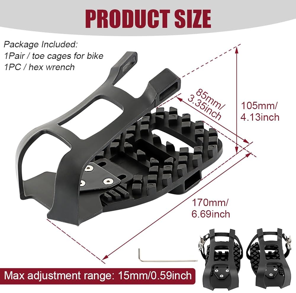 【يمكن تعديلها】مع أوضاع مشبك أصابع القدم القابلة للتعديل، يبلغ الحد الأقصى لنطاق تعديل أقفاص الدراجة 15 مم. سيتأكد دائمًا من أن قدميك في الوضع الصحيح على الدواسة بغض النظر عن حجم قدميك، مقاس القفص من 170 مم إلى 105 مم × 85 مم.