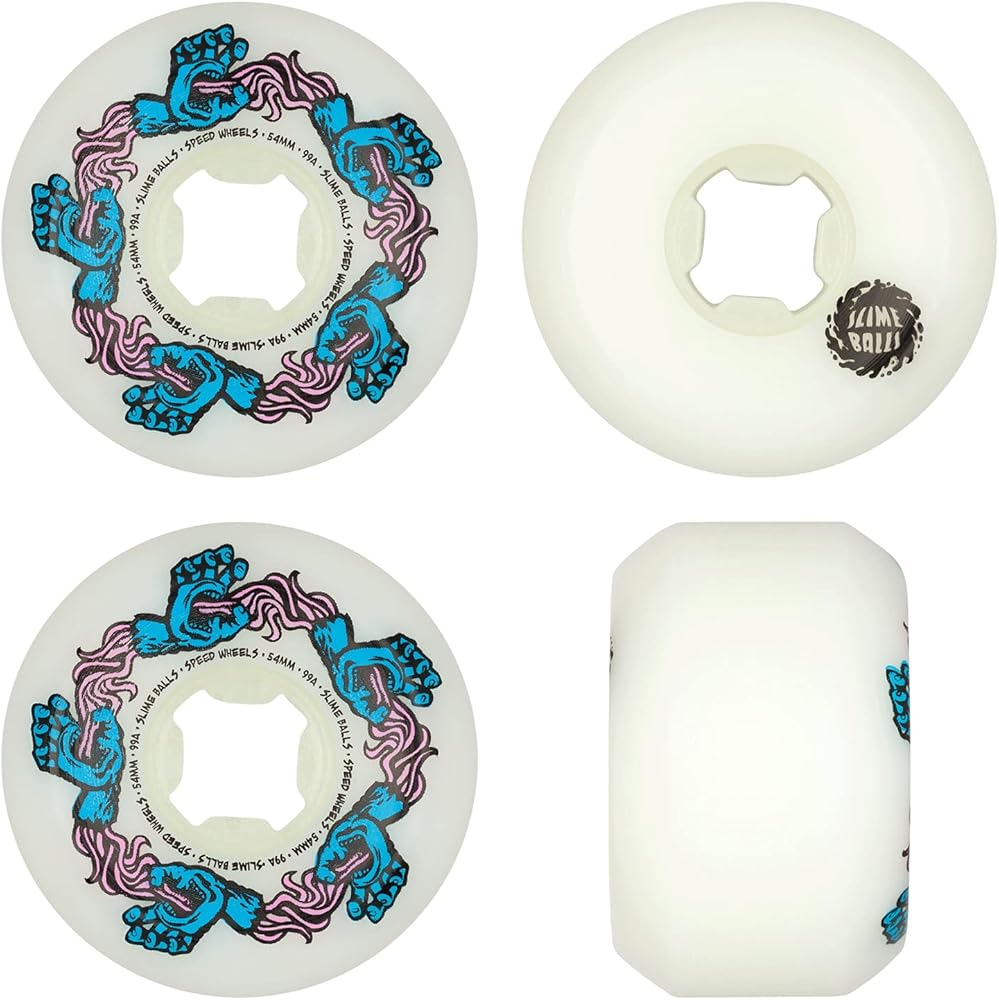 Slime Balls 54mm Infinity Hand Speed Balls wheels feature graphic art by Jim Phillips on a hard, conical edge shape for firm coping lock, wide riding surface and high performance 99a urethane.