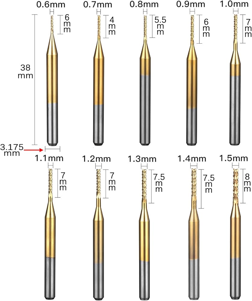المعيار: قطر حافة القطع: 0.6 مم - 1.5 مم / 0.0236 بوصة - 0.059 بوصة؛ قطر الساق: 3.175 ملم / 1/8 بوصة؛ طول حافة القطع: 4 ملم - 8 ملم / 0.157 بوصة - 0.315 بوصة (كما هو موضح في الشكل)