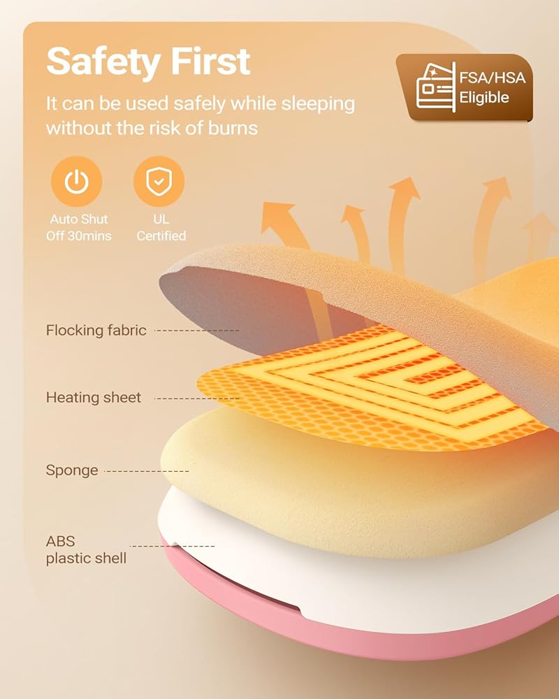 • تقنية التسخين المبتكرة: الجزء الخلفي من وسادة التسخين للتشنجات الشهرية يستخدم ورقة معدنية لتوليد الحرارة، ويمكنها نقل الحرارة بسرعة إلى الجسم في غضون ثانيتين، وبالتالي تعزيز الدورة الدموية واسترخاء العضلات وتخفيف الألم بعمق. ملحوظة: لسلامتك يرجى عدم استخدامه مباشرة على الجلد، يرجى استخدامه من خلال الملابس.