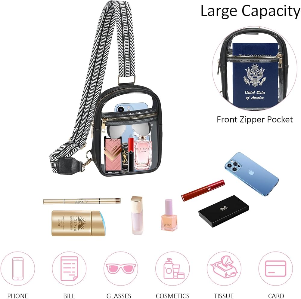 بدون استخدام اليدين: مع جيبين علويين منفصلين بسحاب وحزام مريح، فإن حقيبتنا الشفافة لا تسهل عليك فقط تخزين الأشياء وإزالتها لمنع فقدانها. سواء كنت تركض، أو تذهب إلى حفلة موسيقية، أو تمشي مع كلبك، فإن هذه الحقيبة الشفافة ستحرر يديك وتسمح لك بالاستمتاع بالمزيد.