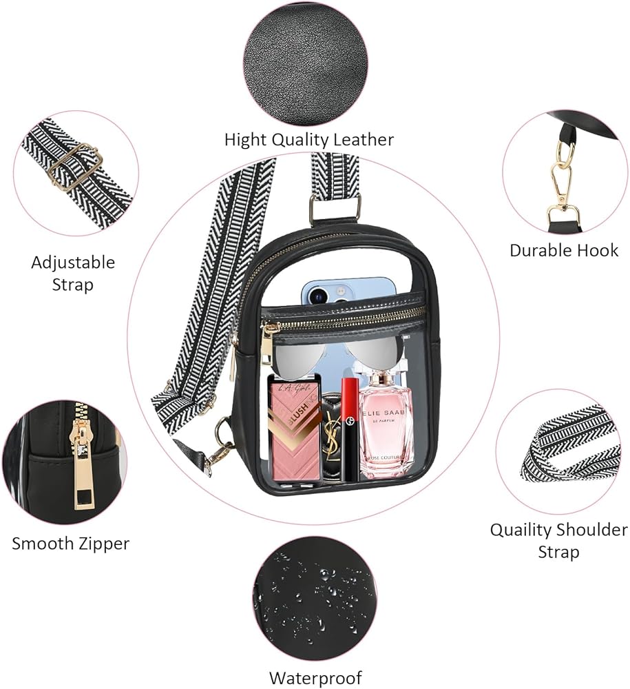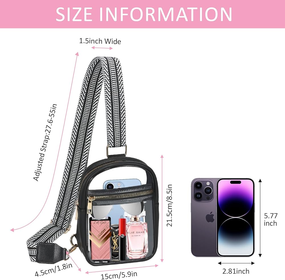 حزام قابل للتعديل: يمكن تعديل حزام الكتف ضمن نطاق من 27.6 إلى 55 بوصة، مما يسمح بملاءمة مريحة وقابلة للتخصيص. يمكنك شد الحزام أو فكه ليصبح حقيبة شفافة تمر بالجسم، أو حقيبة حمل، أو حقيبة فاني، أو حقيبة صدر.