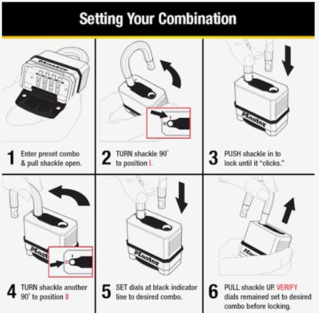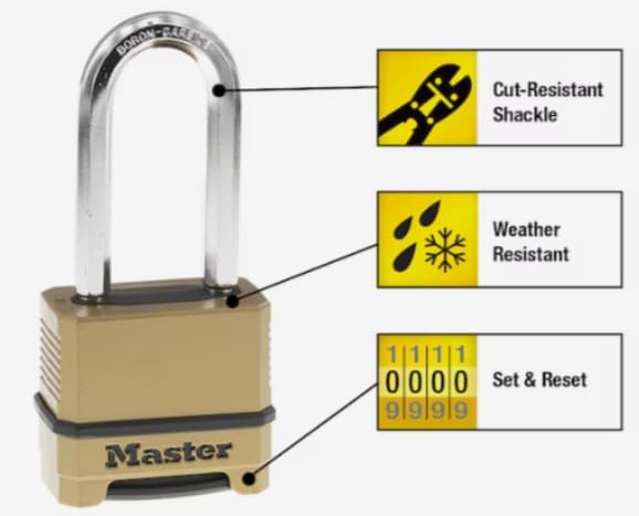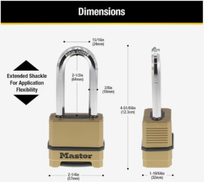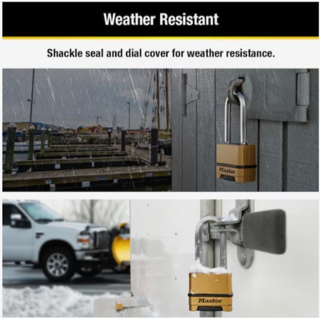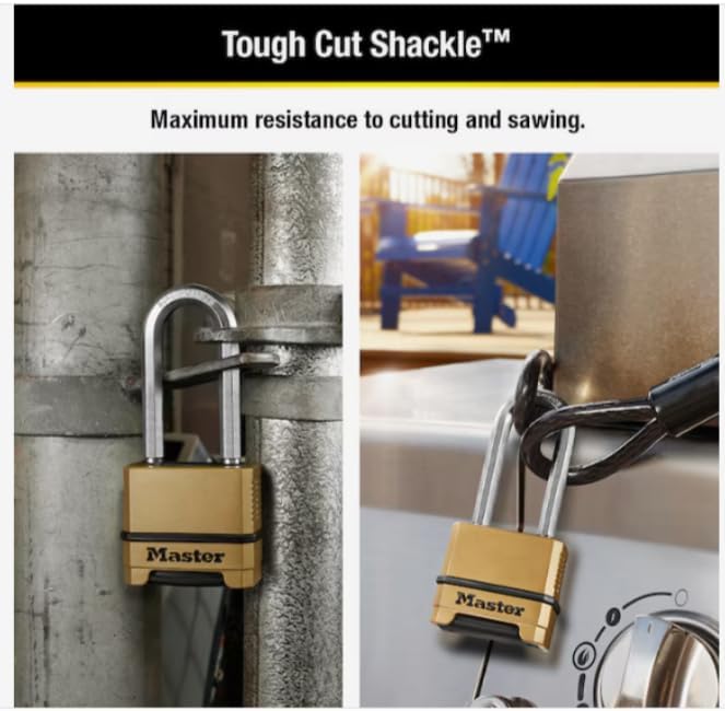 The Master Lock Magnum no. M175XDLJ solid body padlock features a 2in (51mm) wide zinc body for strength and reliability. The 3/8in (10mm) diameter octagonal shackle is 2-1/2in (64mm) long and made of tough-cut boron-carbide, 50% harder than hardened steel, offering maximum resistance to cutting and sawing. The roller pin cylinder provides maximum pick and pry resistance. The hinged dial cover and shackle seal offers superior weather protection, and reinforced body bumper protects against scratches. The lock includes set your own combination convenience, without the need for a reset tool. The lifetime guarantee provides peace of mind from a brand you can trust. Magnum the no 1 choice of professionals Tough-Cut octagonal boron-carbide shackle is 50% harder than hardened steel 2-1/2in (64mm) shackle clearance for more uses 2in (51mm) wide zinc body with reinforced body bumper for scratch resistance Roller pin locking for maximum pick and pry resistance Shackle seal and hinged dial cover for superior weather resistance Set your own combination convenience, no reset tool needed One directional dial feature for low light applications Lifetime guarantee