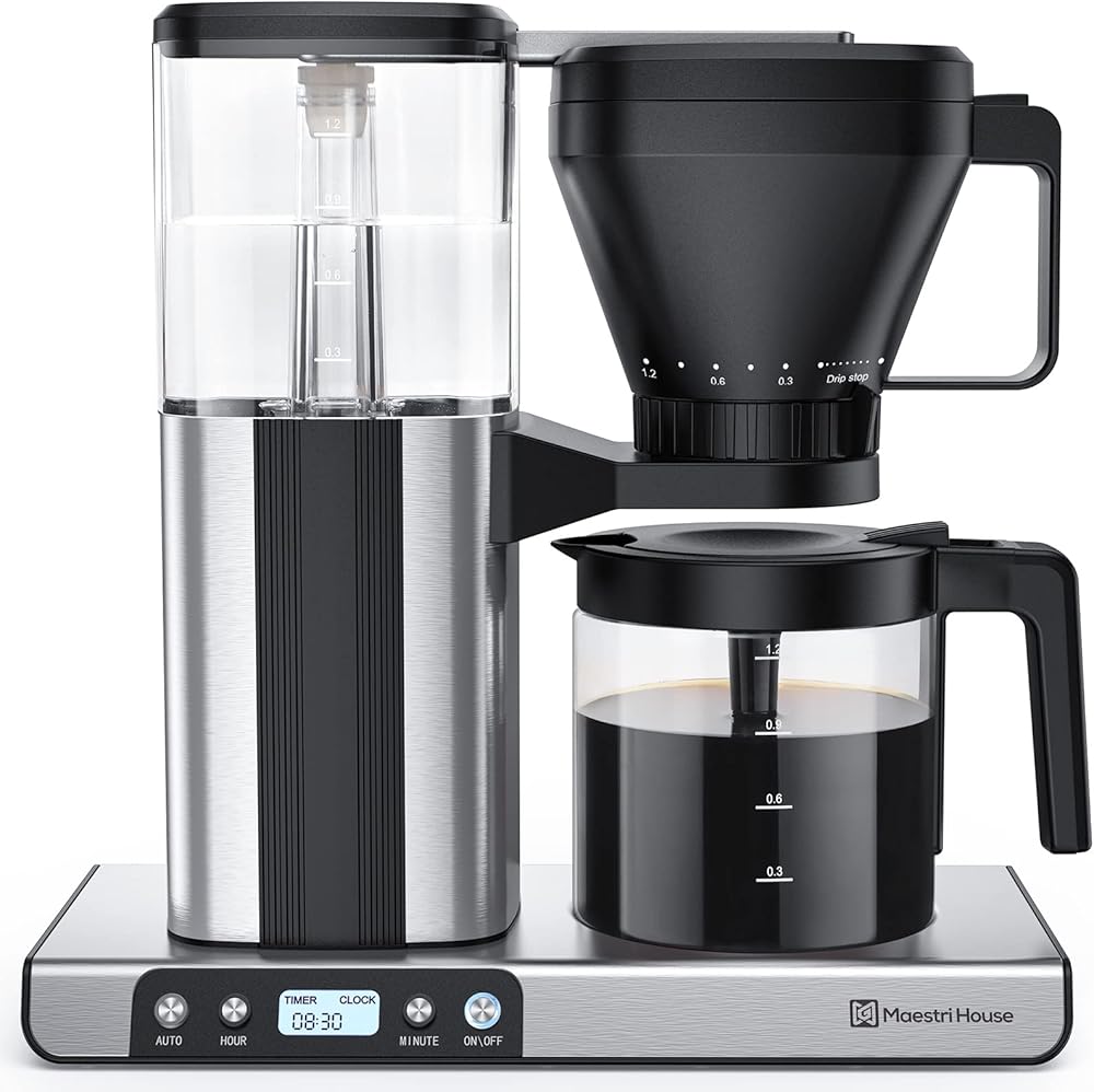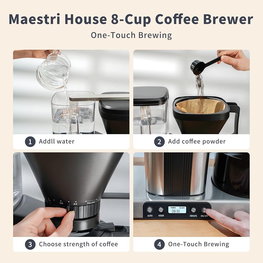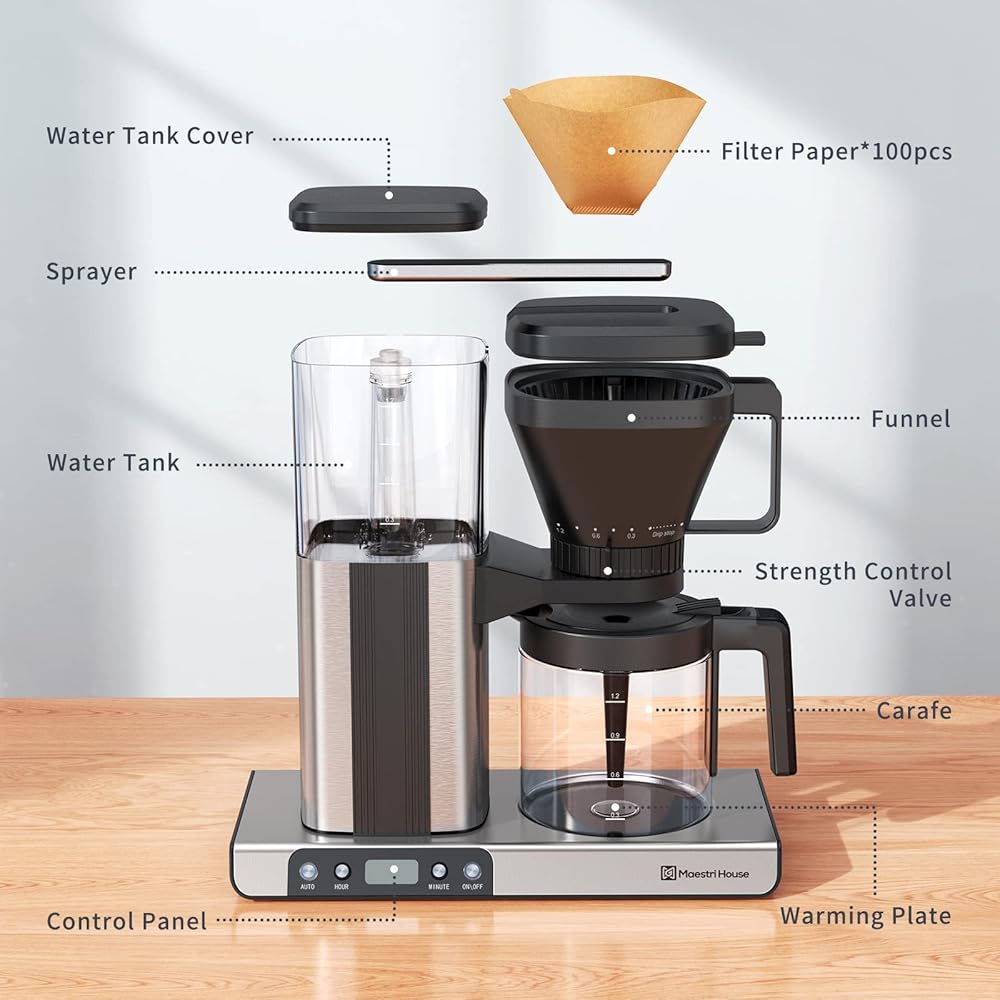 ماكينة صنع القهوة مايستري هاوس، ماكينة صنع القهوة بالتنقيط سعة 8 أكواب مع الفولاذ المقاوم للصدأ، تخمير بلمسة واحدة وقوة قابلة للتعديل، بدء تشغيل تلقائي، إبريق زجاجي وطبق دافئ، خزان مياه بسعة كبيرة 1.2 لتر