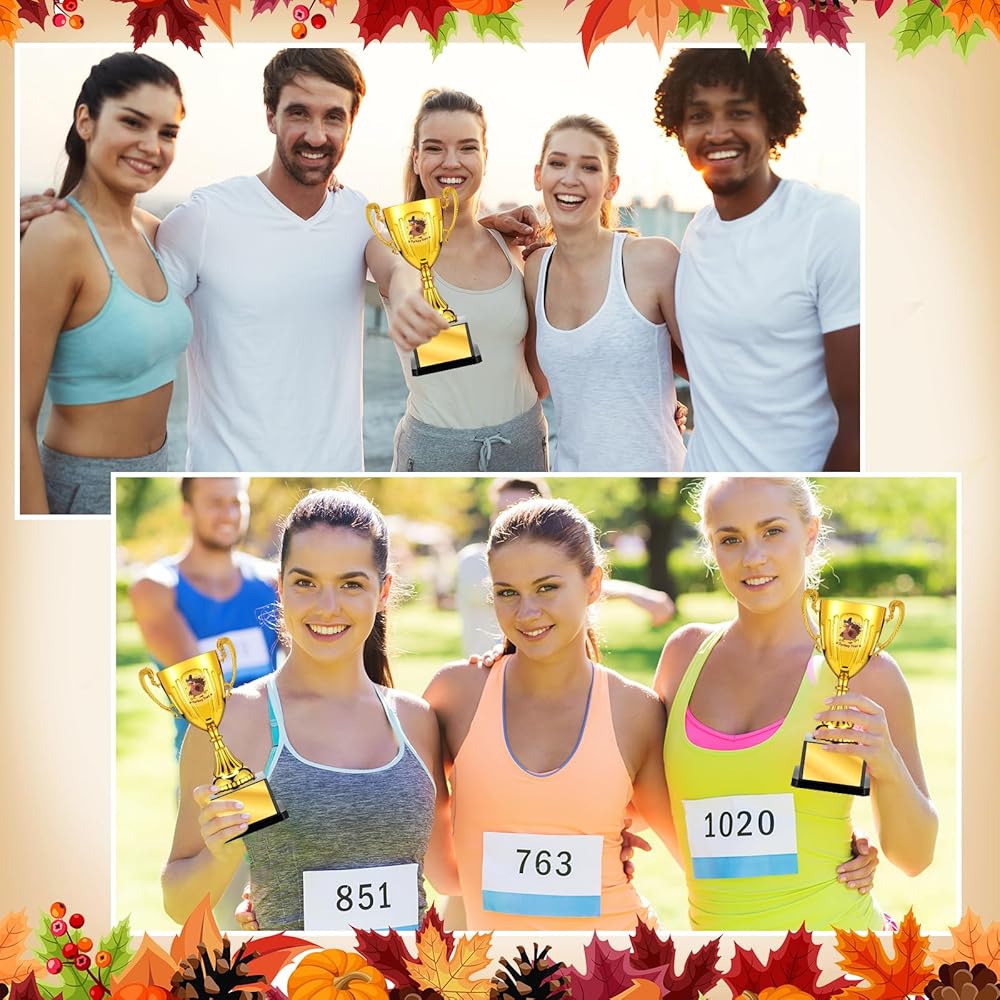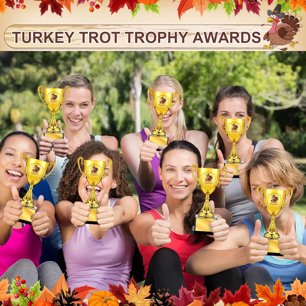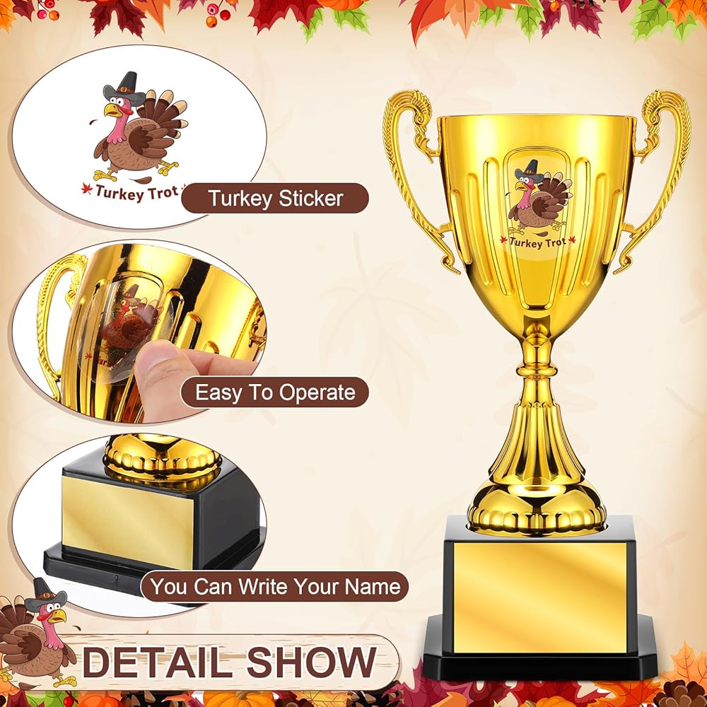 Package Content: the package includes 12 durable plastic turkey trot trophy awards, 12 round turkey stickers, and 12 blank stickers; Besides serving as a charming Thanksgiving decoration, the gold turkey trophy acts as a reward to acknowledge contributions in Thanksgiving celebrations
