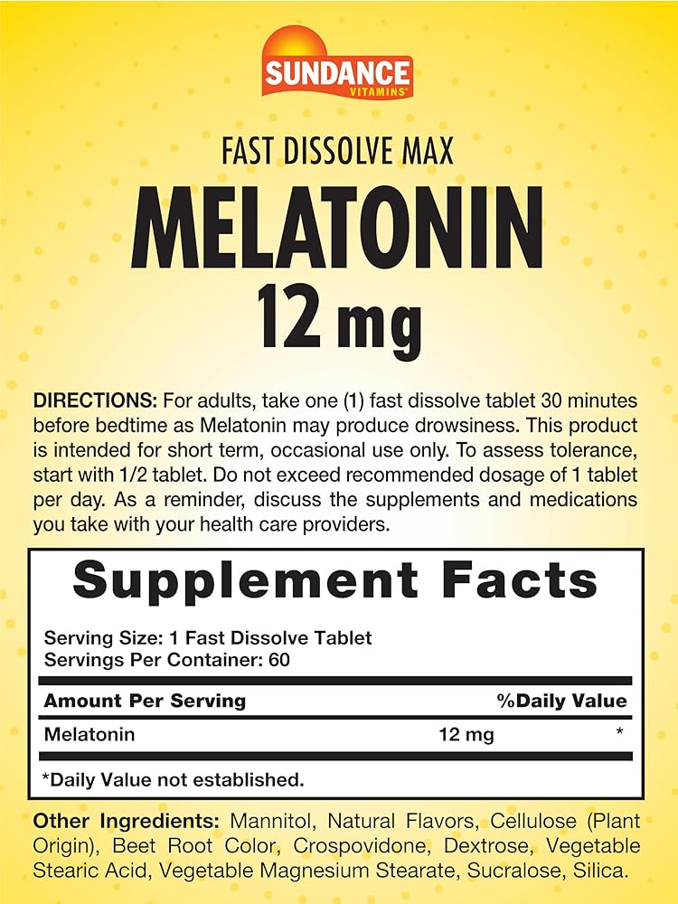 Sundance Vitamins Fast Dissolve Melatonin provides you with 12 mg of Melatonin to help you settle down and prepare for your nightly routine. These delicious natural berry flavored fast dissolvable tablets melt right on your tongue – a great alternative to swallowing pills and more convenient than a liquid.