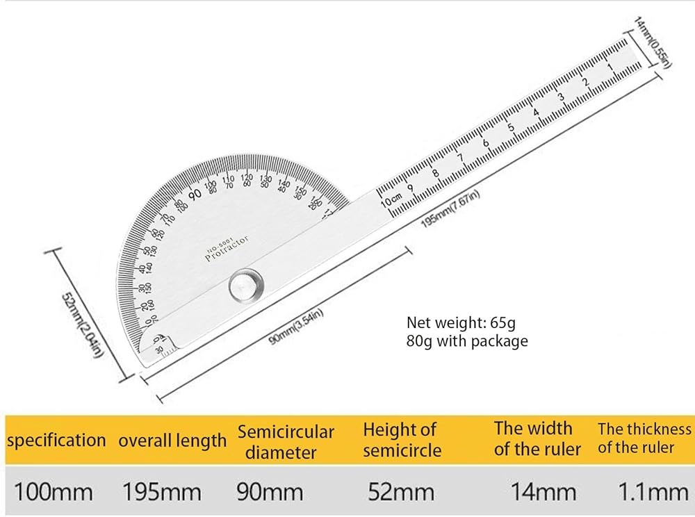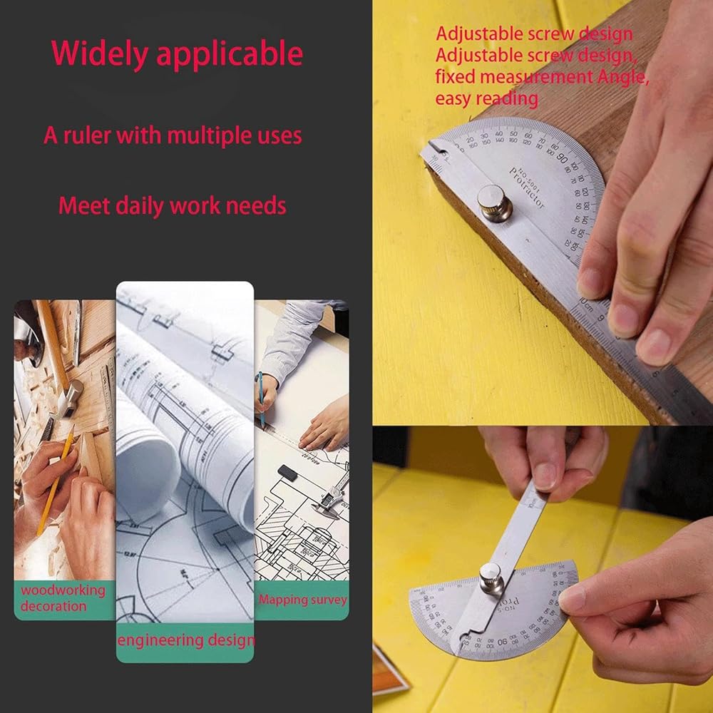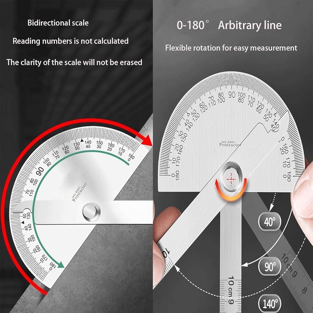 【Feature】:The protractor and ruler are made by laser etching technology, the scale data is clear and accurate, and the reading is convenient.The stainless steel protractor can draw at a fixed angle, suitable for setting bevels, drawing radial lines, measuring lengths and angles, and marking angles, suitable for designers, mechanics, carpenters, and woodworking enthusiasts.