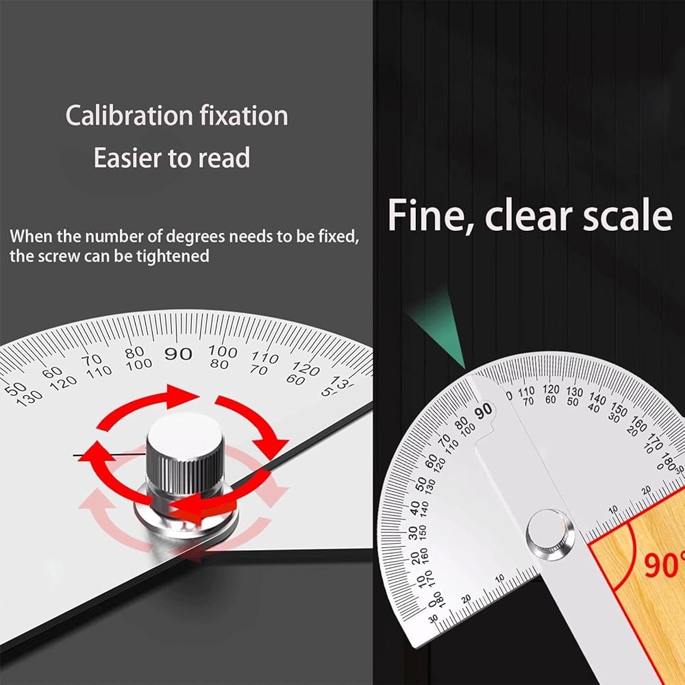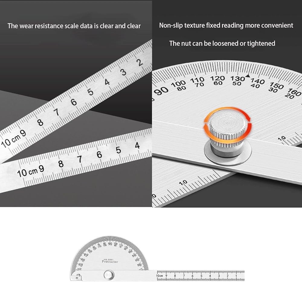 【Material】:The angle protractor 0 to 180 Degrees is made of stainless steel with smooth polishing, good durability, and wear resistance, not easy to rust, nickel-plated nut adjustable for tightness, with non-slip texture and smooth edges.