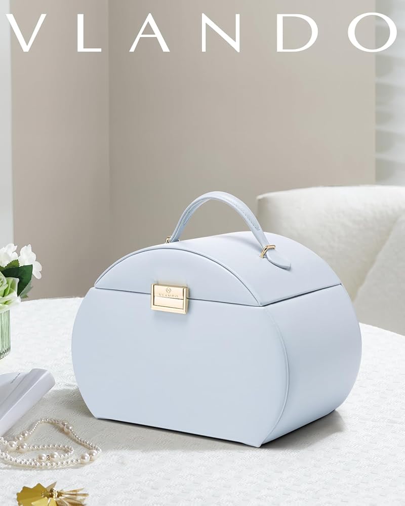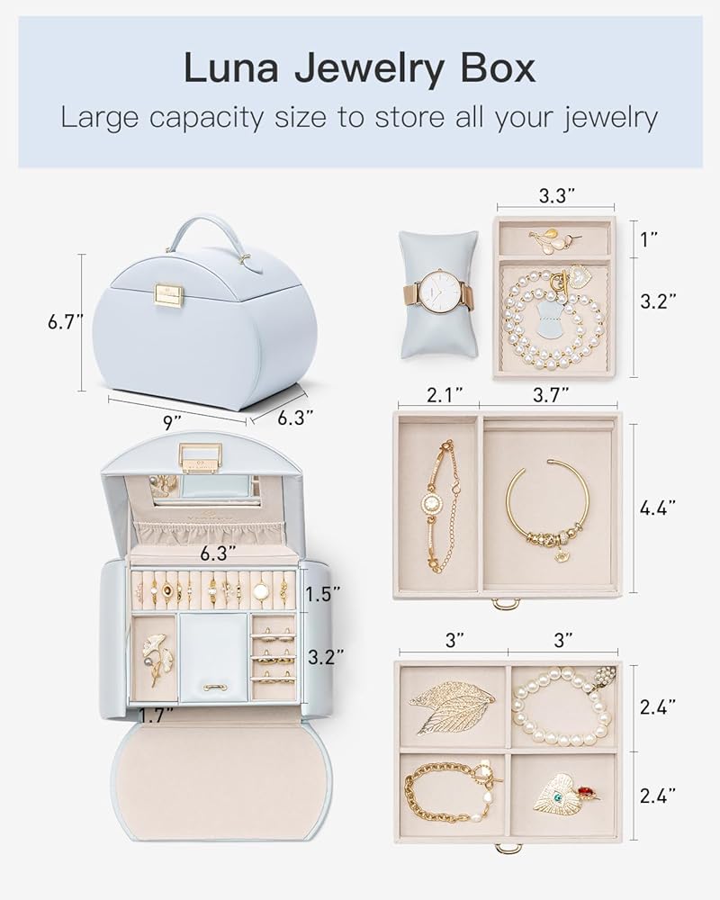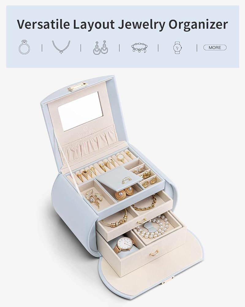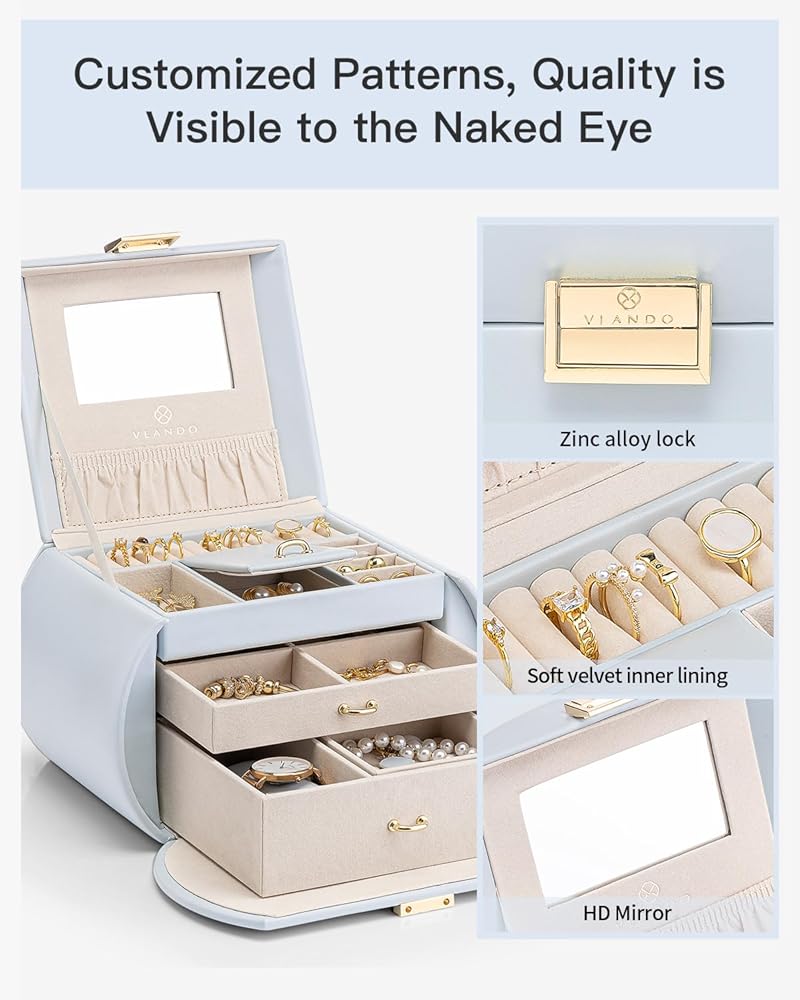 صندوق مجوهرات Vlando للفتيات على طراز الأميرة صندوق مجوهرات للفتيات 3 طبقات صندوق مجوهرات للأطفال مع صندوق مجوهرات مرآة للفتيات 8-12 هدايا عيد الأم للمراهقين (أزرق فاتح)