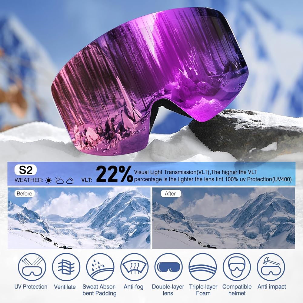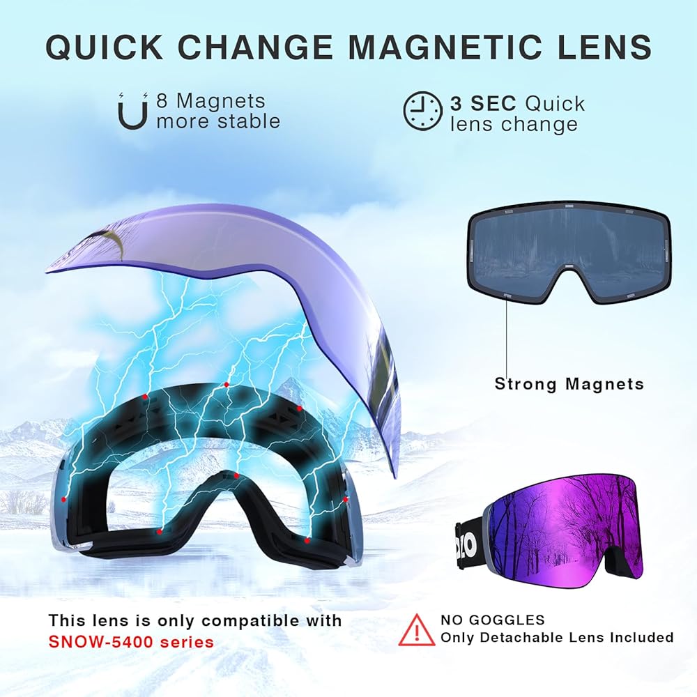 Interchangeable Lens System-8 magnets hold the lens firmly and easy to be replaced for different terrains and light conditions,which also reduces the possibility of the lens flying off when skiing, snowboarding, snowmobiling,climbing and other outdoor sports. We provide 2 lenses,one for sunny or cloudy conditions and a yellow lens VLT 89% for low light conditions.