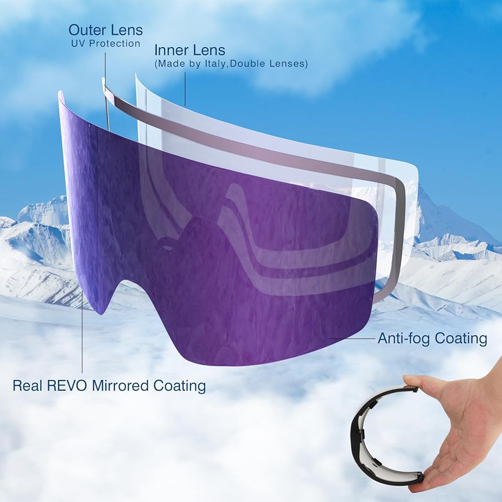 High Performance Anti-fog Double Lens-Double lens snowboard goggles adopt environmental protection real revo mirrored coating process,anti-scratch,anti-fog,impact resistance, 100% UV protection,more solid & durable than other ski goggles. The inner lens are made by Italy CP long-lasting anti fog performance materials,working with ventilation system, which can prevent fogging effectively and persistently.