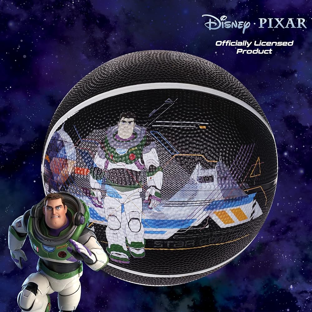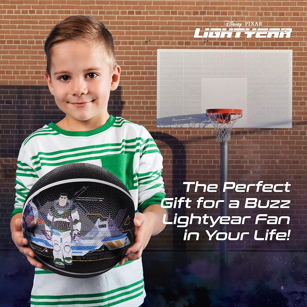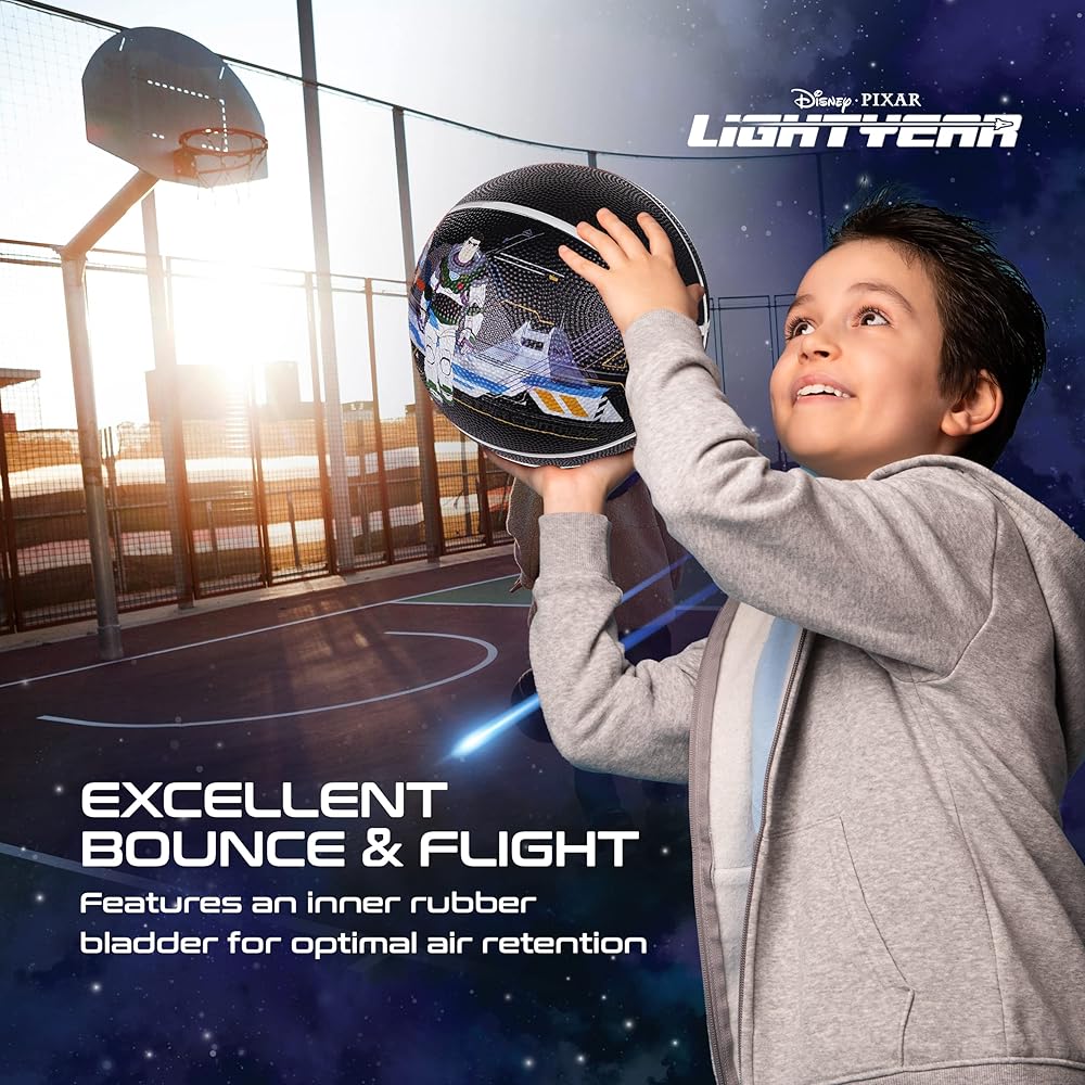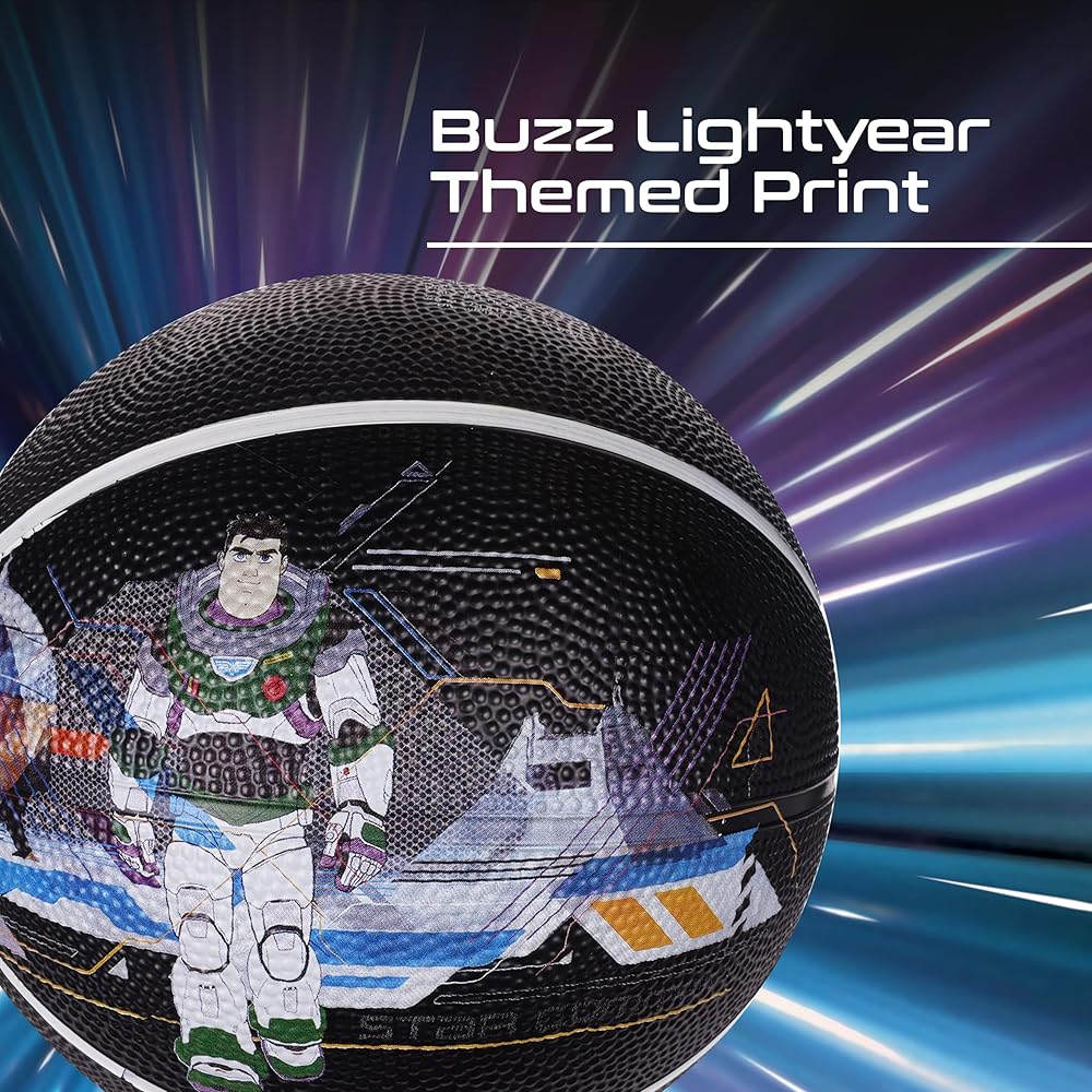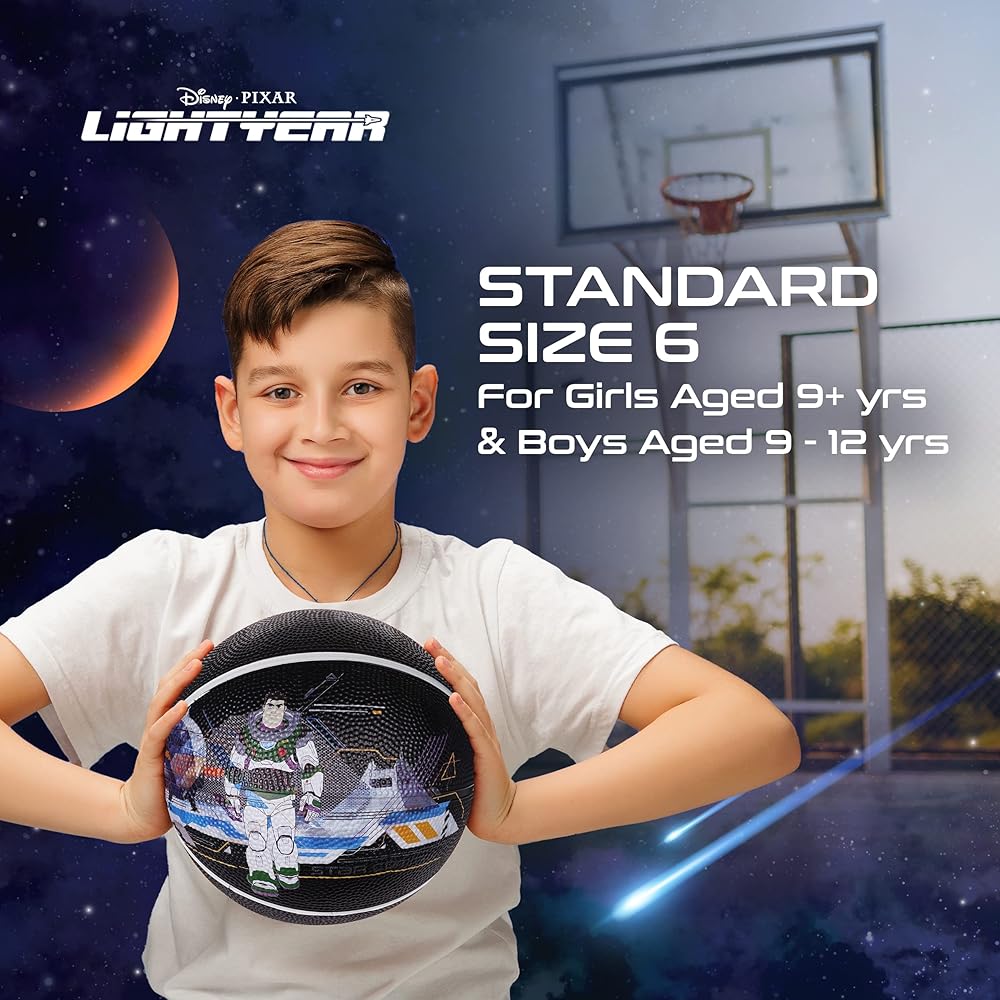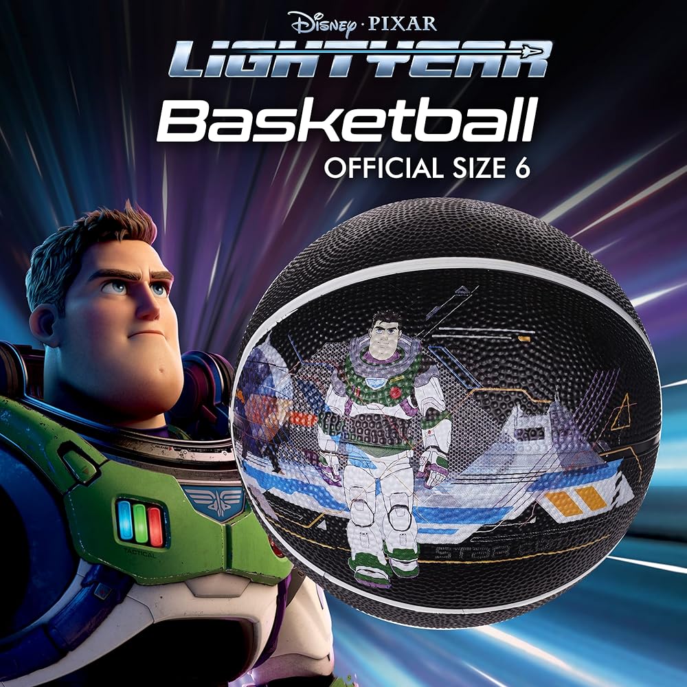 Complete the evolution from beginner to pro player, and give basketball gifts to the Disney fan in your life with the Disney Lightyear size 6 child's basketball. Constructed with a strong and sturdy rubber composite material, this inside and outside use basketball can stand up to frequent pavement and court use, and can take a beating on the hoops, backboards, and from passing up and down the court. The junior size basketball features an interior rubber bladder for optimal air retention to ensure the best bounce-passes and overall balance, and has a 28.5 centimeters circumference perfect for boys and girls 12 to 14 years old. These kid basketballs are officially licensed Disney athletic equipment, ensuring that you are receiving genuine and authentic items.