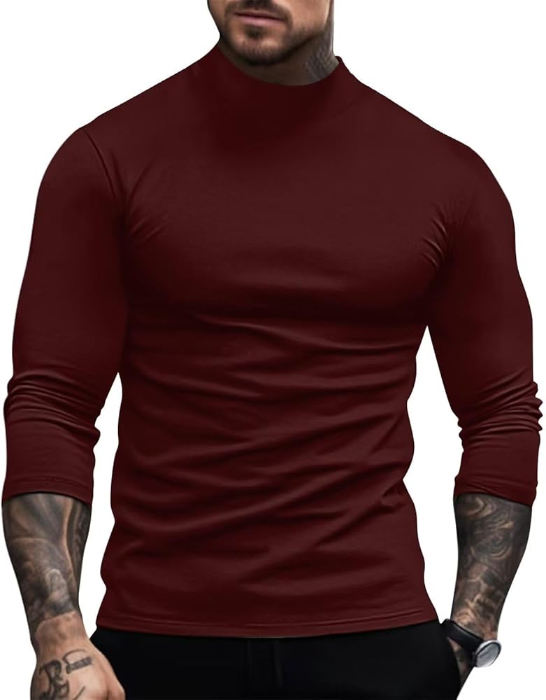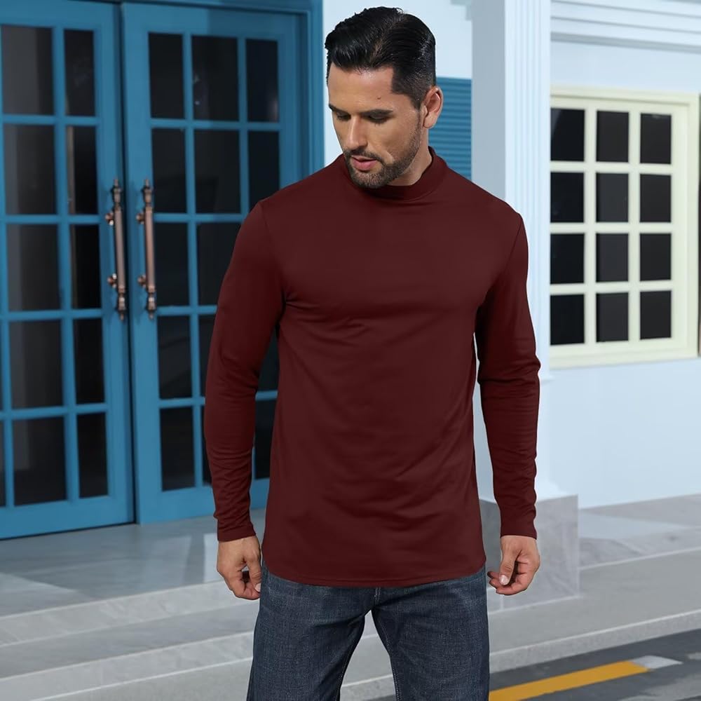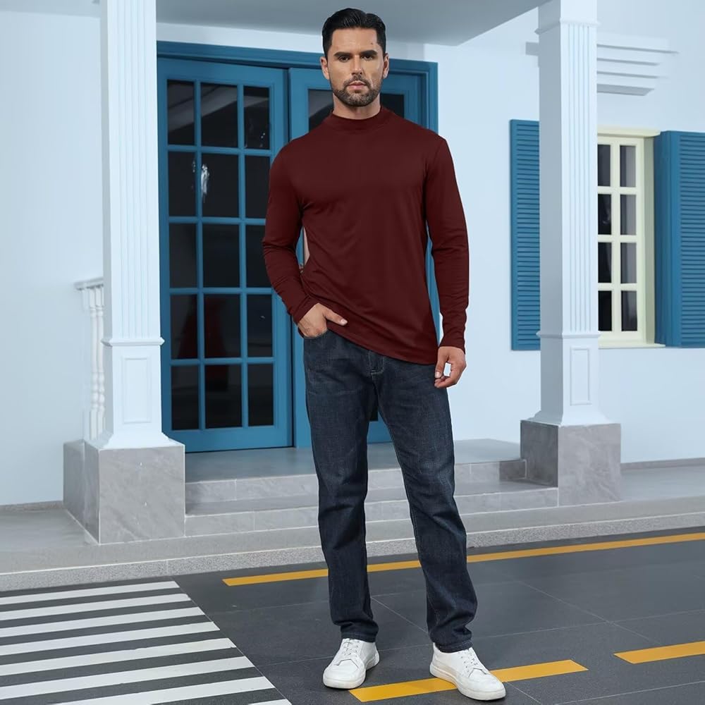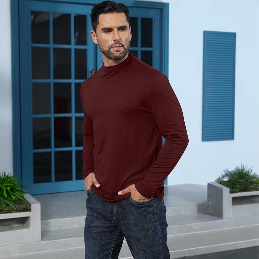نسيج فاخر: نسيج القميص الرجالي برقبة السلحفاة خفيف الوزن وناعم، وخصائص حرارية وقابلية تمدد عالية. تم تصميم القميص ذو الياقة المدورة ليتناسب بشكل مريح ولكن ليس مقيدًا، مما يجعله مريحًا في الارتداء.