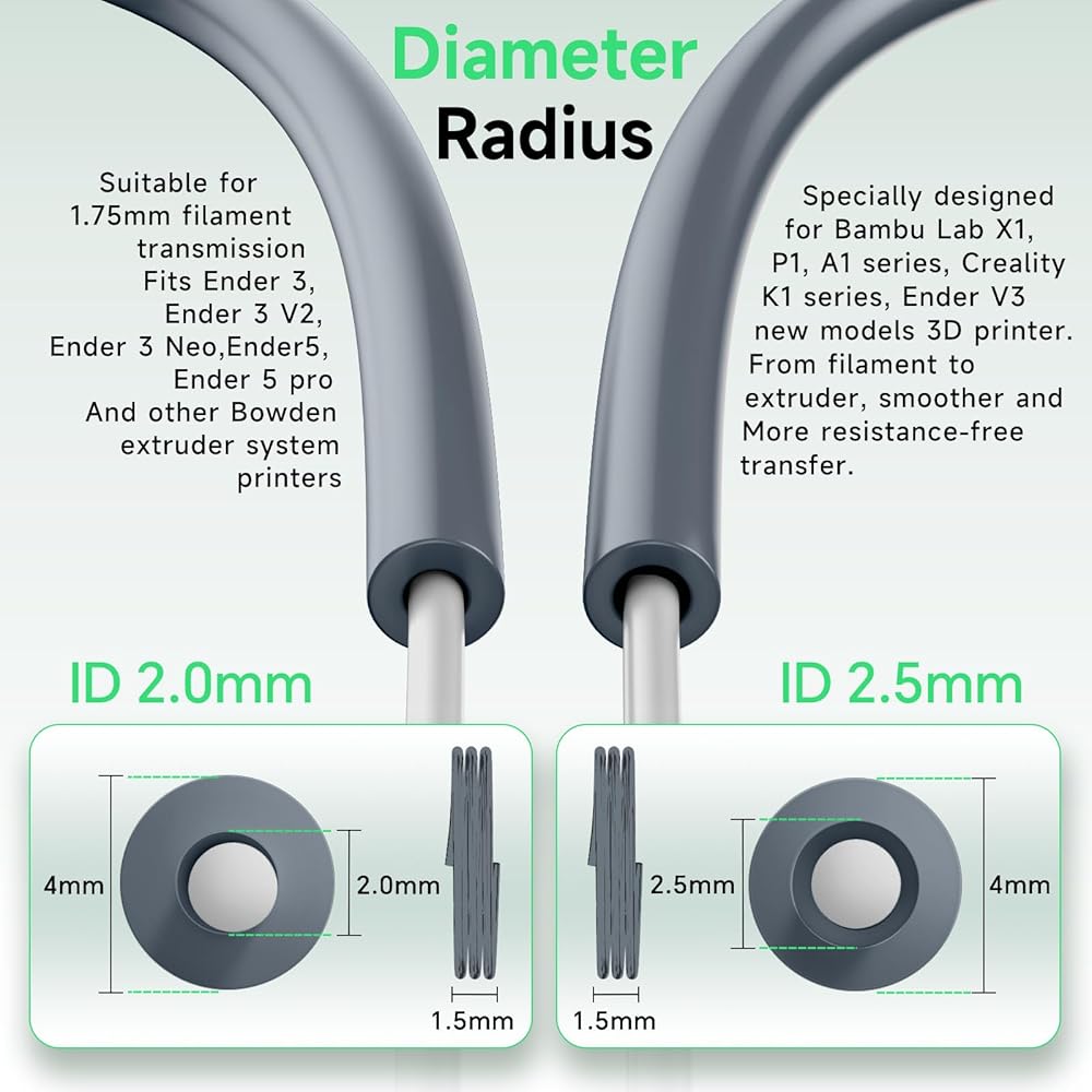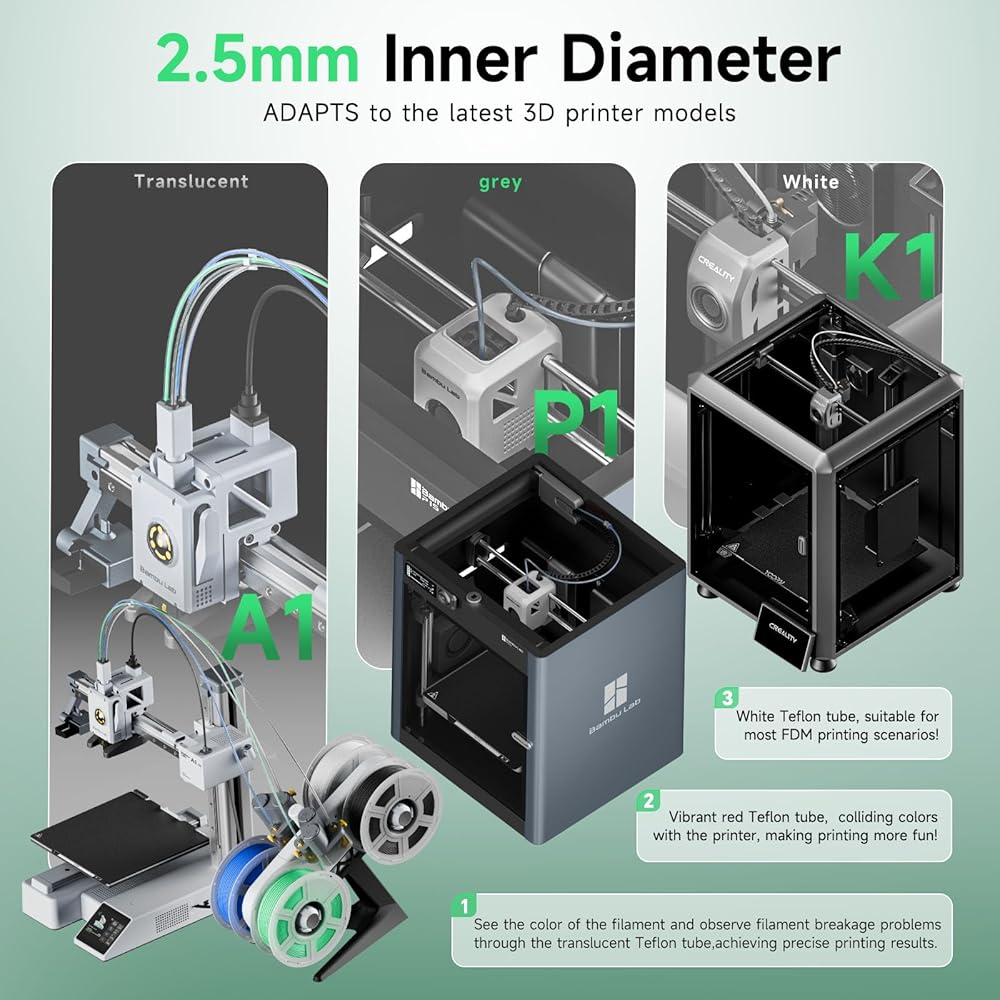 • 【Designed for Direct Drive Extruder 3D Printer】 This teflon tube is designed to be highly compatible with Direct Drive Extruder 3D printers For Bambu Lab A1/A1 mini/P1P/P1S/X1C and Creality K1/K1 Max/Ender 3 V3 , ensuring seamless integration for optimal performance. Experience smooth filament feeding and consistent printing results with our reliable product.