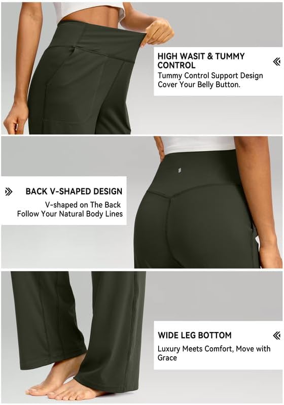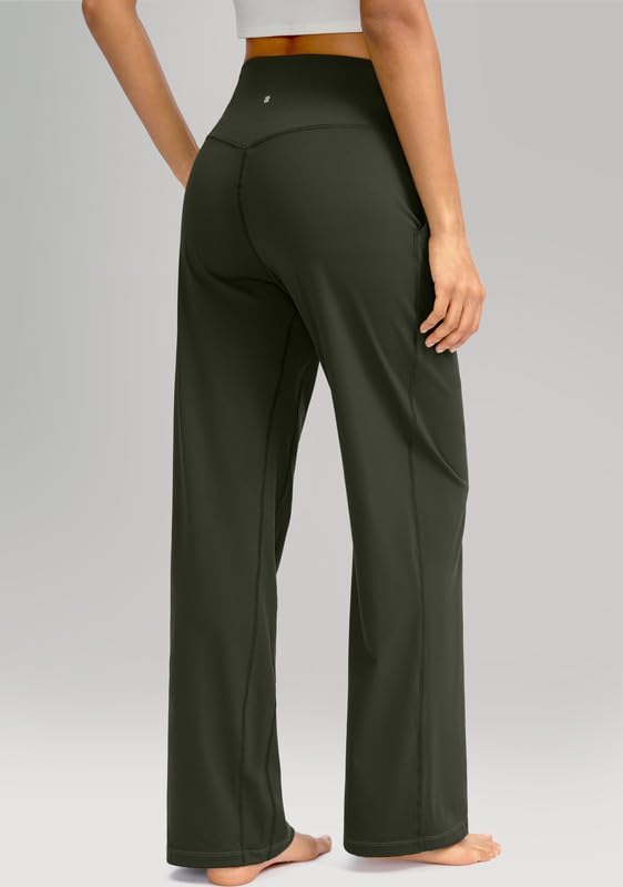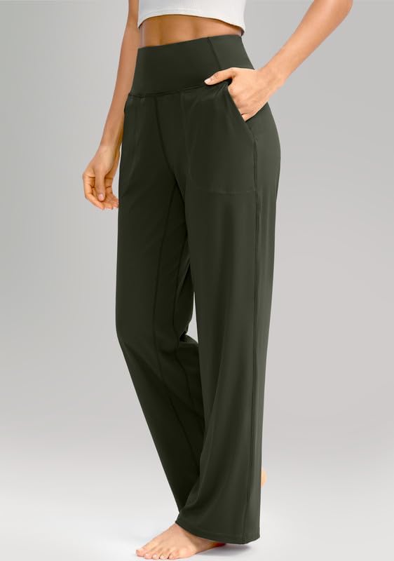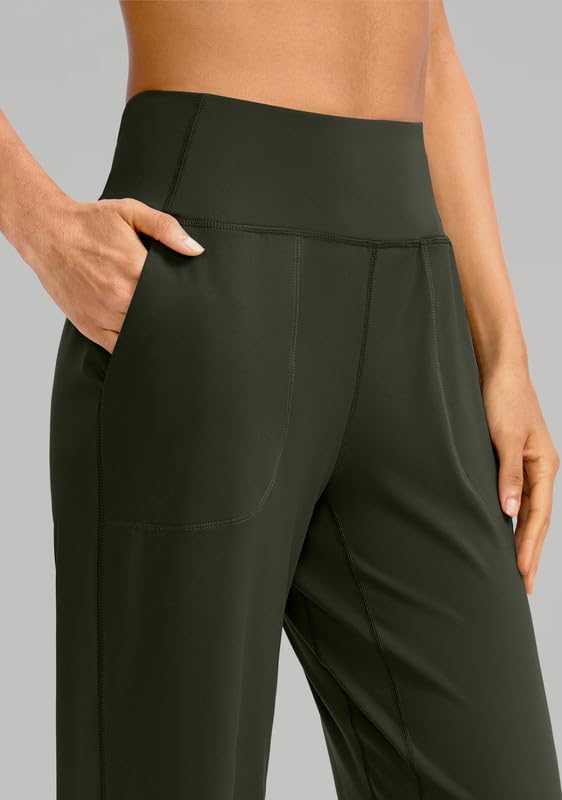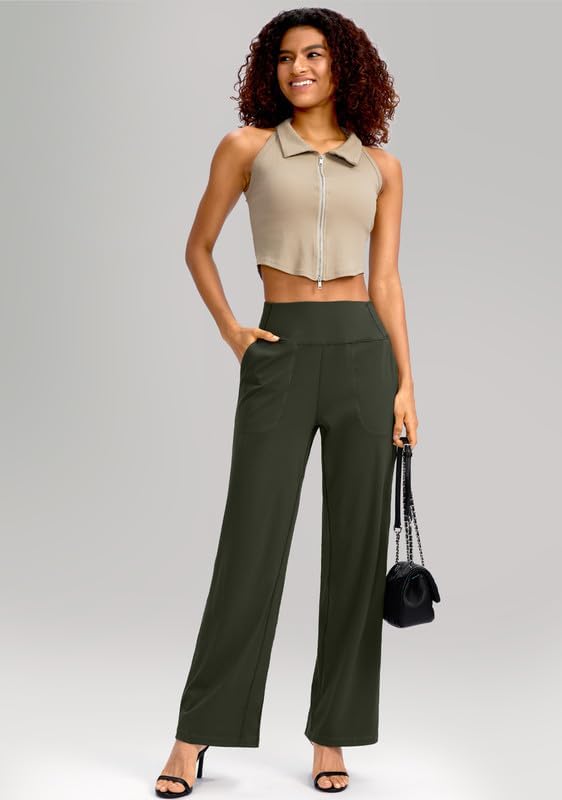 سراويل Soothfeel واسعة الساق للنساء، سراويل عمل اليوغا مع جيوب، سراويل رياضية عالية الخصر، سراويل صغيرة/طويلة 28 بوصة (أخضر جيشي، L)