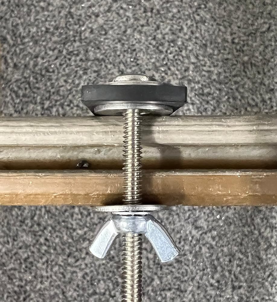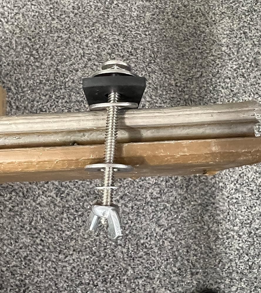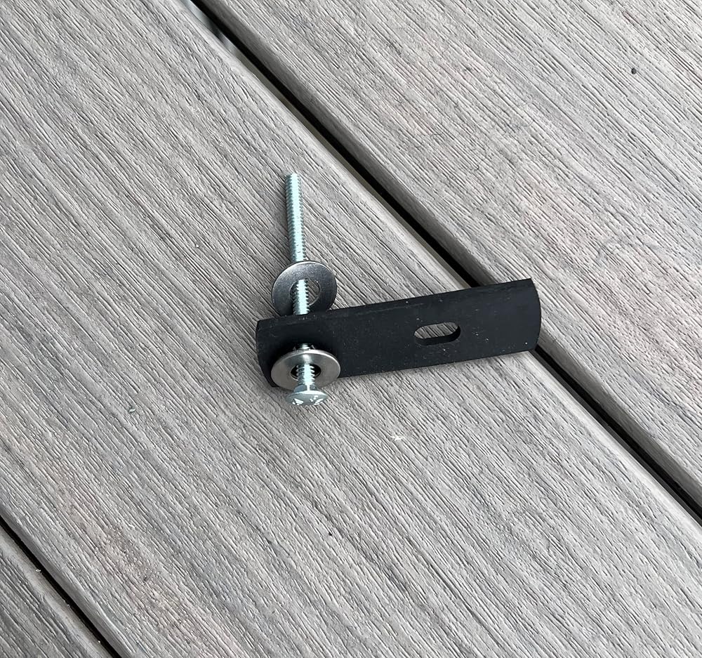 • Instructions: On top of the deck slide the bolt down the gap between the boards with one large washer on top and bottom of the black strap in the small hole. Hold the bolt in place. Have a second person go under the deck and tighten the wing nut with the large washer on first and the lock washer on second. Thats it.