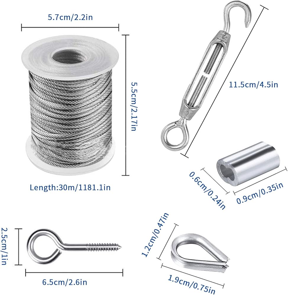 【Turnbuckle Wire Tensioner Kit】- Our turnbuckle wire tensioner kit includes all you need for easy installation. It comprises of a 50ft/15M 5/64" stainless steel coated cable wire, 2 M5 turnbuckles with hook and eye, 4 80mm M5 lag screw eye screws, 4 M3 stainless steel thimbles, and 8 M3 aluminum crimping loop sleeves.