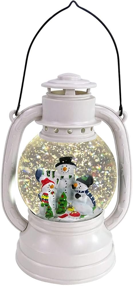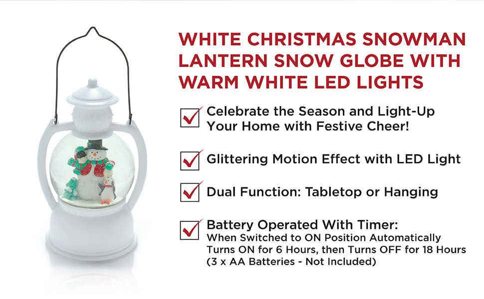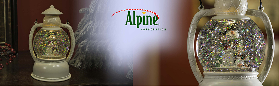 Add festive cheer to your desktop or anywhere in your home with the Alpine Corporation's 8"H White Christmas Snow Globe Lantern with Warm White LED Light! This festive decorative piece features a classic snow globe lantern design to bring nostalgic holiday joy to your home. Inside the globe is a cheerful snowman family illuminated by a warm LED light to brighten your décor. The glittering snow is kept afloat by a hidden motor for your convenience. This vintage lantern decoration requires 3 AA batteries (not included) to operate. The lantern decor features a convenient timer for 6 hours on and 18 hours off to save battery life and ensure a hassle-free experience. Measuring 5"L x 4"W x 8"H (10" with the handle), the Alpine Corporation White Christmas Snow Globe Lantern is the perfect addition to your holiday décor! Alpine Corporation is one of America's leading designers, importers, and distributors of superior quality home and garden decor products. Alpine Corporation's award winning in-house design team continuously develops new and innovative "statement pieces" for your home and garden. Your indoor and outdoor living spaces will be the envy of the neighborhood with our wide assortment of fresh, fashionable and contemporary products, from beautifully crafted solar garden stakes featuring patented motion and fiber optic lighting technology to beautiful fountains and delightful bird baths and feeders.