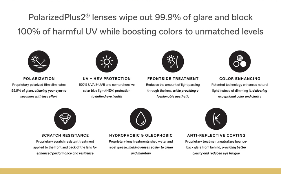 Enjoy ultimate UV protection combined with premuim style, incredible durability, glare-free vision, and color-boosting patented technologies