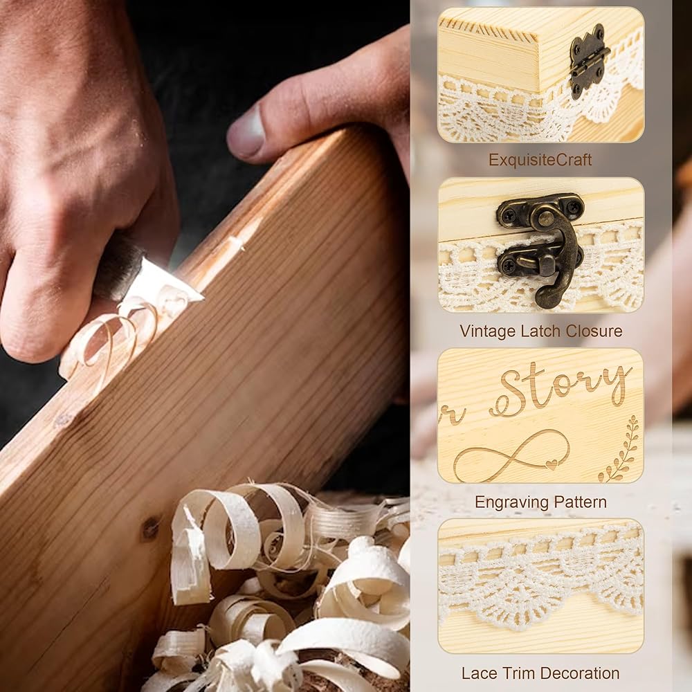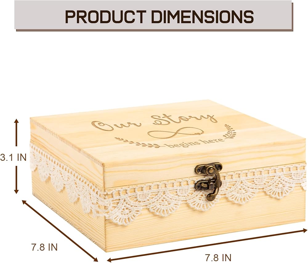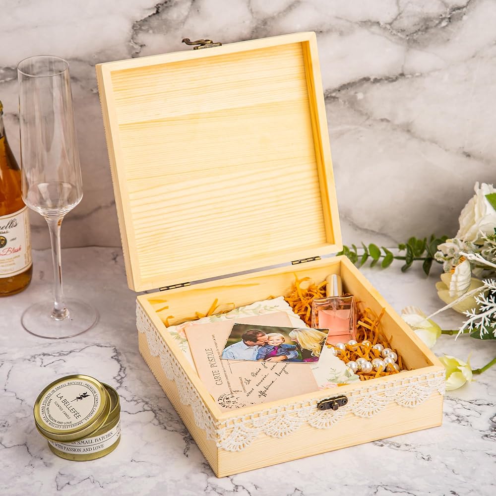 【Preminum Quality】External size: 7.8 x 7.87 x 3.1 inches. Handcrafted with pinewood, our keepsake box with lid is more solid than plywood. The natural wood grain is more in harmony with nature.The wooden craft box features a gold hook closure that ensures your items are safely inside. The outer lace decoration makes the box more exquisite and retro.