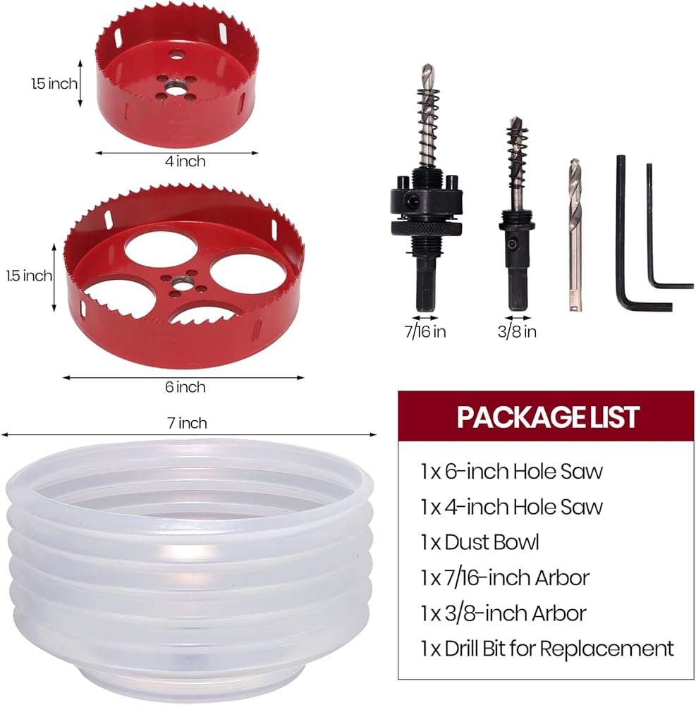 مجموعة كاملة لتركيب الإضاءة المجوفة: تتضمن العبوة منشار ثقب 6 بوصة، ومنشار ثقب 4 بوصة، ووعاء غبار، وشجرة منشار ثقب، وقطعة مثقاب بديلة ومفتاح سداسي لمجموعة كاملة وجاهزة للاستخدام.