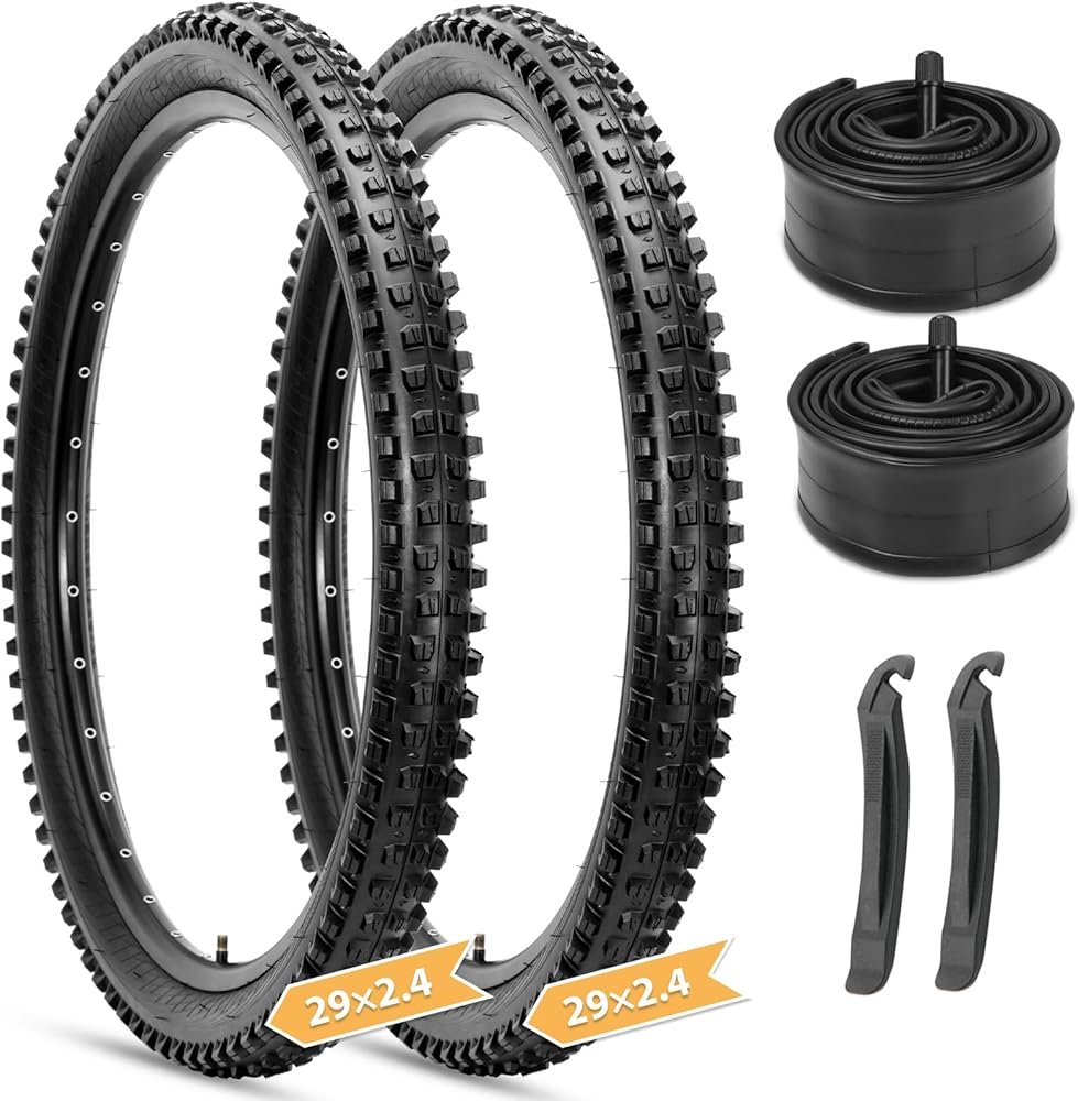 • تشتمل العبوة على إطارين للدراجة، وأنبوبين للدراجة، ورافعتين للإطارات.