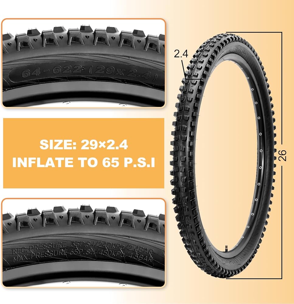 • حجم الإطار: 26 × 2.4 بوصة (ETRTO: 64-599 مم)؛ الحد الأقصى للنفخ إلى 65 رطل لكل بوصة مربعة (450 كيلو باسكال /4.5 بار).