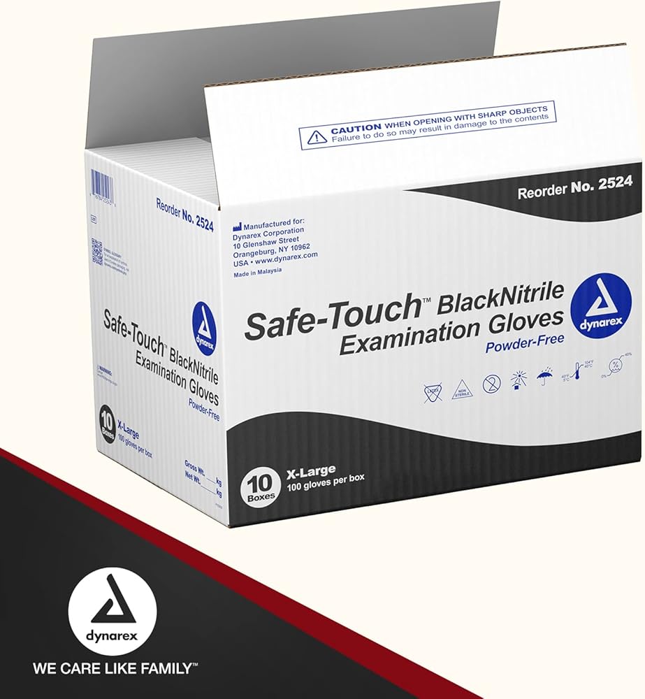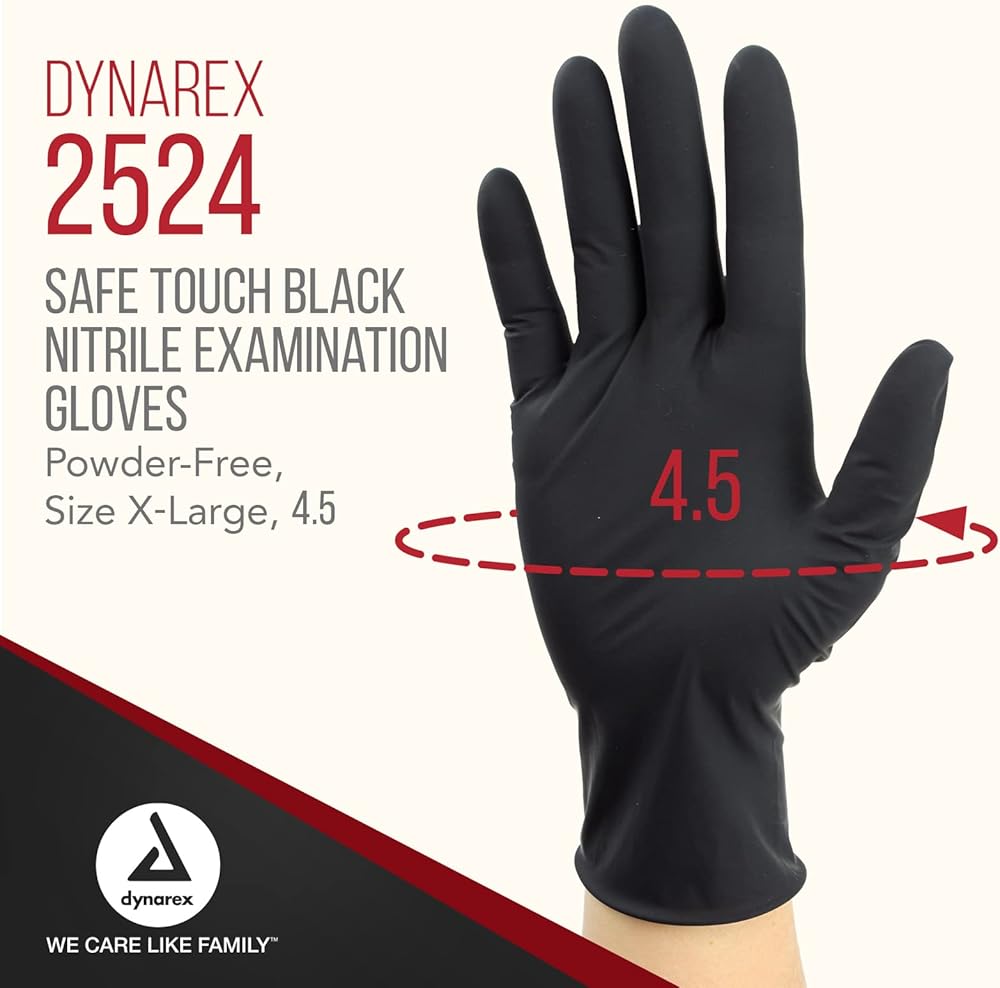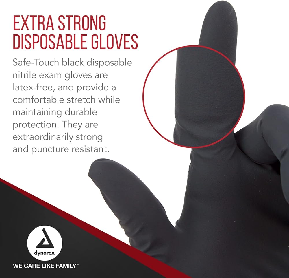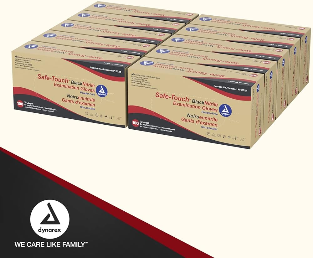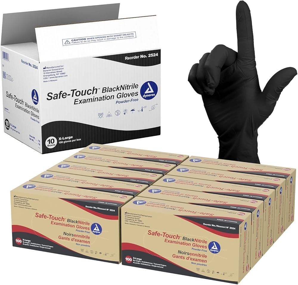 قفازات Dynarex BlaDynarex ذات اللون الأسود للاستعمال مرة واحدة، خالية من البودرة، تستخدم في الرعاية الصحية والإعدادات المهنية، على سبيل المثال. كبير، 1 علبة، 10 صناديق من 100